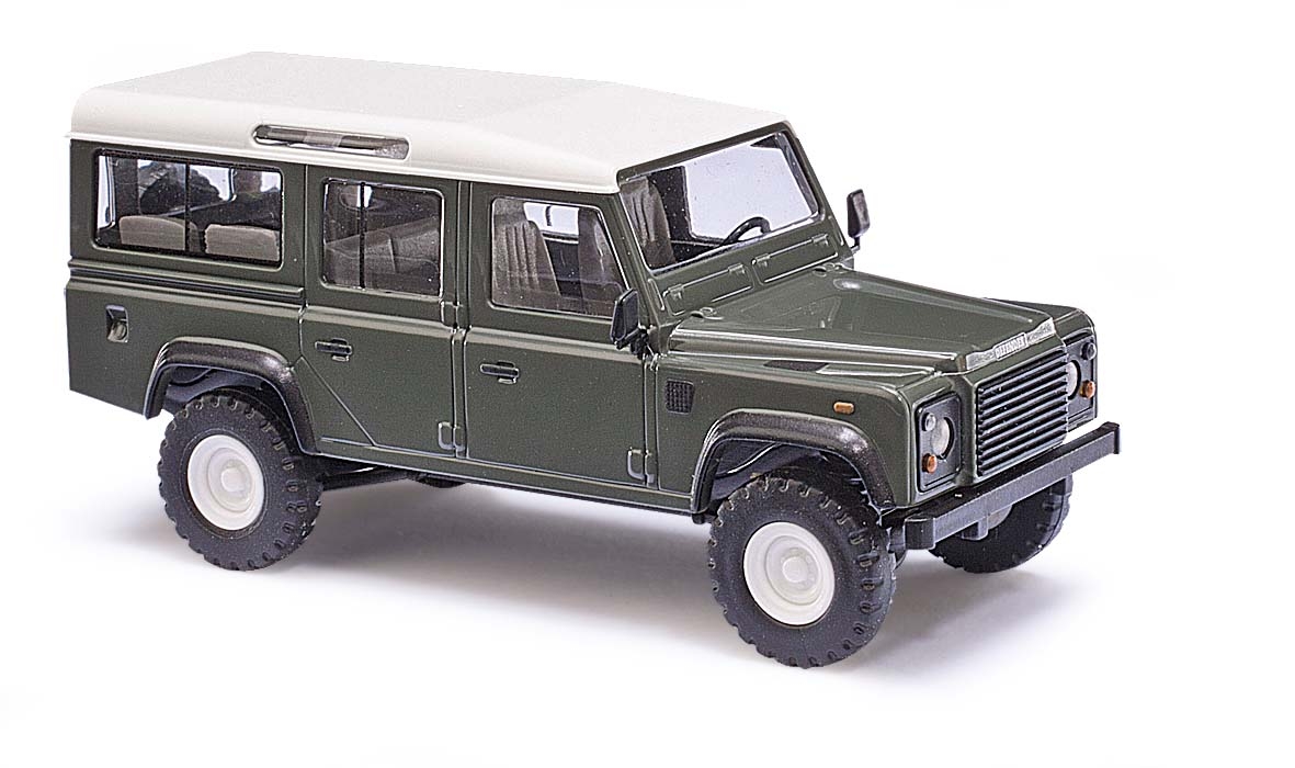 Das ursprünglich für zivile Nutzung entwickelte Fahrzeug wurde dank seiner Robustheit häufig bei unwegsamen Expeditionen eingesetzt, so ist es auch kein Wunder, dass der Defender noch heute in vielen Krisengebieten zu finden ist. Bei verschiedenen Hilfsorganisationen und auch beim Militär ist das zuverlässige Fahrzeug nicht mehr wegzudenken. Besonders in privaten Bereichen wird der robuste Land Rover als Geländefahrzeug hoch geschätzt. Endlich fährt dieses Kraftpaket auch in unwegsamen H0-Modelllandschaften über Stock und Stein und begeistert nicht nur die Miniatur-Bevölkerung. Scharfe Konturen und detailreiche Features machen aus dem groben kantigen Klotz ein richtiges Schmuckstück. Auch die charakteristische Sitzanordnung der Innenausstattung ist vorbildgerecht wiedergegeben, ebenso wie das andersfarbige Dach mit den schmalen seitlichen Fensterschlitzen. Die Frontansicht des Modells wird beherrscht durch die große schwarze Kühlermaske, in der helle transparente Scheinwerfer in Klarglasoptik sowie feinste transparente Blinker eingesetzt sind. Feinste Drucke von Fensterstreben und Fenstergummis sowie die präzisen Drucke der Rücklichter vervollkommnen den Detailreichtum der Miniatur. Die grobstolligen Reifen und typgerechten Felgen perfektionieren das markante Erscheinungsbild. Mit diesem Modell erhält die Busch-Geländewagen-Collection ein weiteres Highlight an geländegängigen Fahrzeugen mit Kultstatus.
