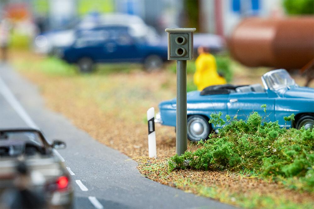 Die Radarfalle ist mit einer sehr hellen LED ausgestattet und anschlussfähig mit einem Vorwiderstand für 12?16 V DC vorbereitet. Beim Überfahren des eingebauten Sensors (Art. 161773, liegt nicht bei) wird das Blitzlicht ausgelöst. Es kann jeweils ein Blitzerkasten für H0 oder N gebaut werden.
