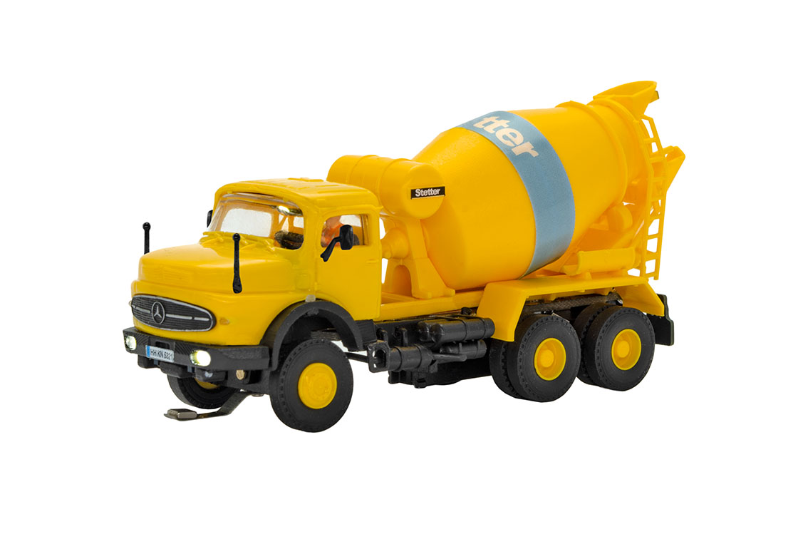 H0 MB Rundhauber 3-achs BetonmischerBasis, Funktionsmodell - Wie alle Modelle der CarMotion-Serie verfügt das Fahrzeug über folgende Funktionen: - Lade- und Programmieranschluss - Kurze Ladezeiten durch moderne Li-Po Akkus - Mit einer Akkuladung ist bei normalem Fahrbetrieb mit Wartezeiten und verschiedenen Geschwindigkeiten eine Laufzeit von ca. 4 – 6 Stunden, bei Höchstgeschwindigkeit von ca. 2 Stunden möglich - Einfaches Ein-/Ausschalten mit Hilfe eines Reedkontakts unter dem Dach der Fahrerkabine mit Magnetstift oder Teleskop-Magnetstab Art. 8410 - Infrarot-Sender/-Empfänger für Abstandssteuerung (nur bedingt mit anderen IR-Systemen kompatibel) - Realistische Brems- bzw. Beschleunigungsvorgänge und konfigurierbarer Geschwindigkeit durch drehzahlgeregelten Motor - Freie Ladefläche durch Unterflurantrieb - Kabinenbeleuchtung - Bremslichter und Rückfahrscheinwerfer - Blinker rechts/links und Warnblinker steuerbar - Abblendlicht / Fernlicht - Dachblinker (abhängig vom Fahrzeugtyp) - Einsehbare Fahrerkabine mit Figur - 5-polige Steckkupplung zum Anschluss von CarMotion Anhängern oder Aufliegern - Kompatibel zu vorhandenen Systemen mit Fahrdraht oder Magnetband - Steuerung über Infrarot-Signale, Dauermagnete Art. 8431 in der Straße, elektromagnetische Stopp-Spulen und Fernbedienung Art. 8402 - Selbst ohne Spurhilfen ist eine kurze geradlinige Rückwärtsfahrt mittels Steuerung über die Fernbedienung möglich Vorbilddaten: MERCEDES BENZ LB 2624, 177 kW/240 PS Dieselmotor, Stetter Transportbetonmischer 6 FH, Trommelinhalt 6 m³, Gesamtgewicht 26 t. L 9,3 x B 3,3 x H 4,3 cm
