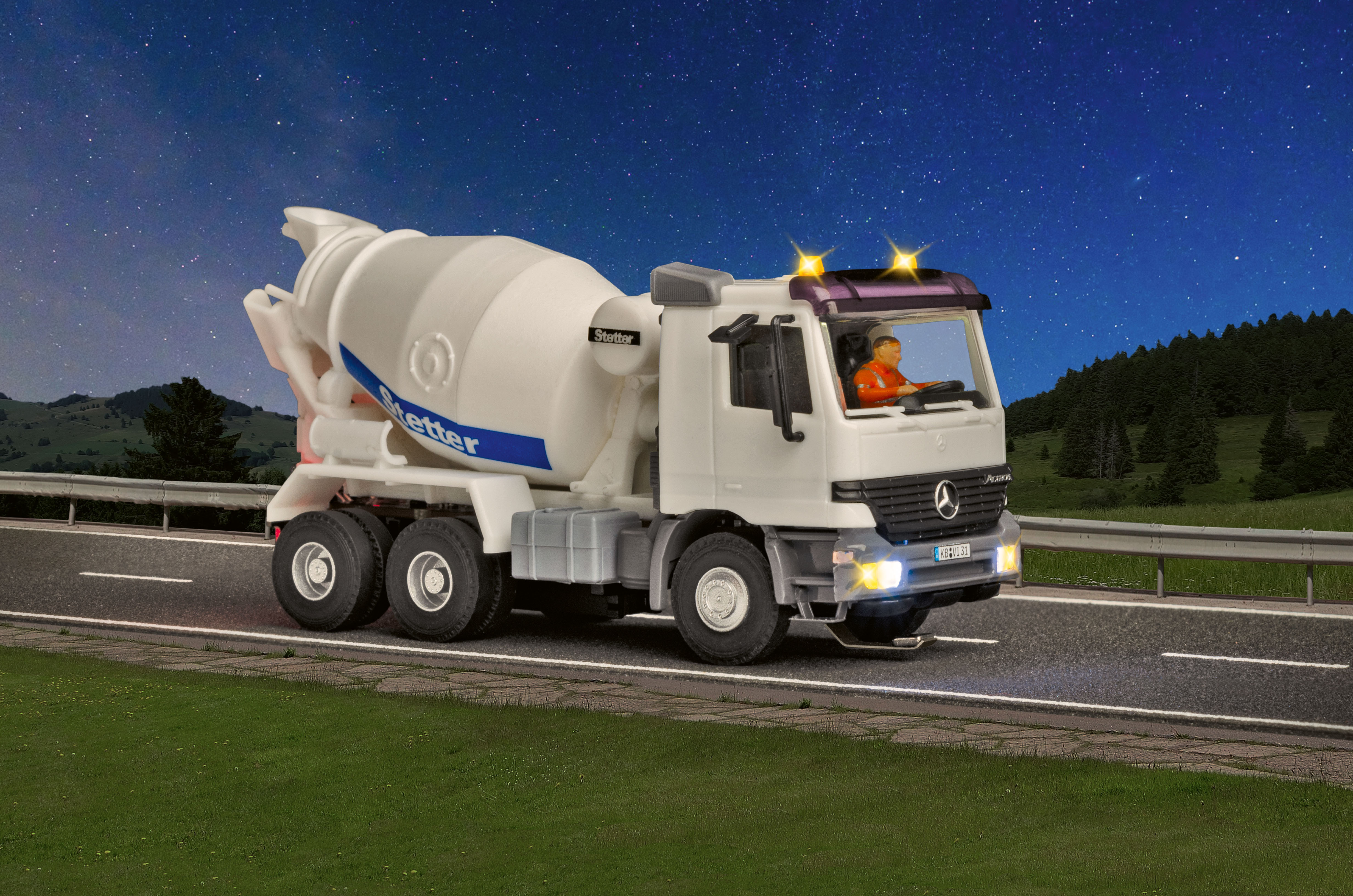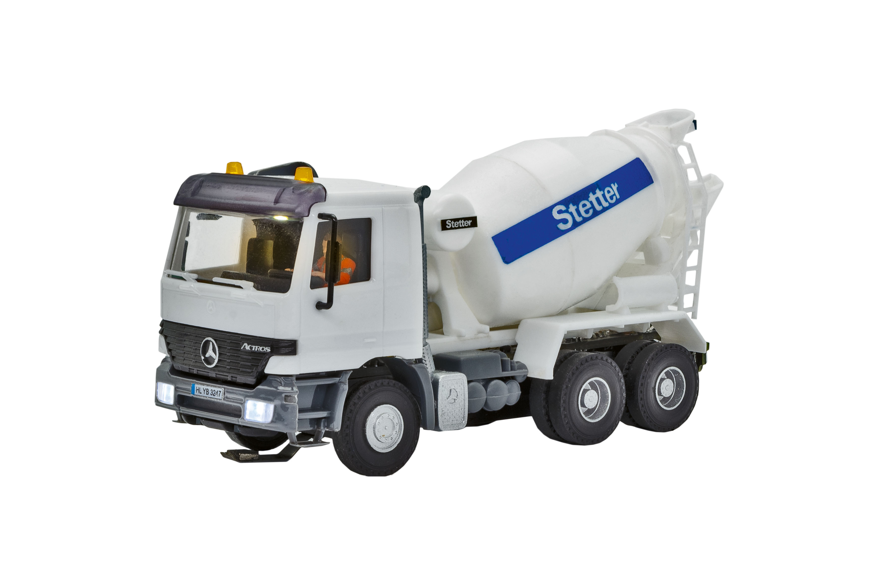 H0 MB ACTROS 3-achs Betonmischer mitRundumleuchten, Basis, Funktionsmodell - 1996 stellte Mercedes die ACTROS-Reihe in unterschiedlichen Varianten vor. Dieses Fahrzeug ist mit einem M-Fahrerhaus ausgestattet. Wie alle Modelle der CarMotion-Serie verfügt es über folgende Funktionen: - Lade- und Programmieranschluss - Kurze Ladezeiten durch moderne Li-Po Akkus - Mit einer Akkuladung ist bei normalem Fahrbetrieb mit Wartezeiten und verschiedenen Geschwindigkeiten eine Laufzeit von ca. 4 – 6 Stunden, bei Höchstgeschwindigkeit von ca. 2 Stunden möglich - Einfaches Ein-/Ausschalten mit Hilfe eines Reedkontakts unter dem Dach der Fahrerkabine mit Magnetstift oder Teleskop-Magnetstab Art. 8410 - Infrarot-Sender/-Empfänger für Abstandssteuerung (nur bedingt mit anderen IR-Systemen kompatibel) - Realistische Brems- bzw. Beschleunigungsvorgänge und konfigurierbarer Geschwindigkeit durch drehzahlgeregelten Motor - Freie Ladefläche durch Unterflurantrieb - Kabinenbeleuchtung - Bremslichter und Rückfahrscheinwerfer - Blinker rechts/links und Warnblinker steuerbar - Abblendlicht / Fernlicht - Dachblinker (abhängig vom Fahrzeugtyp) - Einsehbare Fahrerkabine mit Figur - 5-polige Steckkupplung zum Anschluss von CarMotion Anhängern oder Aufliegern - Kompatibel zu vorhandenen Systemen mit Fahrdraht oder Magnetband - Steuerung über Infrarot-Signale, Dauermagnete Art. 8431 in der Straße, elektromagnetische Stopp-Spulen und Fernbedienung Art. 8402 - Selbst ohne Spurhilfen ist eine kurze geradlinige Rückwärtsfahrt mittels Steuerung über die Fernbedienung möglich L 8,8 x B 3,5 x H 4,5 cm