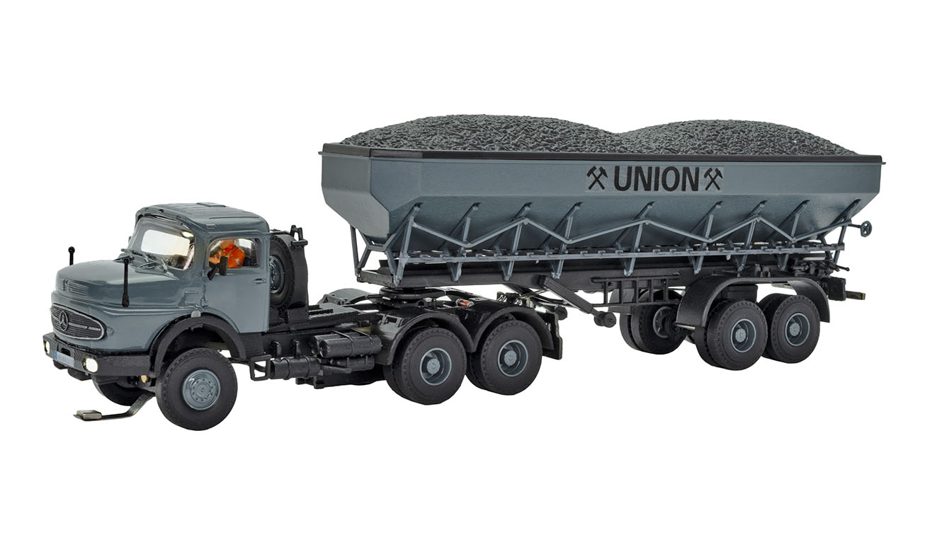 H0 MB Rundhauber 3-achs mit Kohlenkuli UNION,Basis, Funktionsmodell - Wie alle Modelle der CarMotion-Serie verfügt das Fahrzeug über folgende Funktionen: - Lade- und Programmieranschluss - Kurze Ladezeiten durch moderne Li-Po Akkus - Mit einer Akkuladung ist bei normalem Fahrbetrieb mit Wartezeiten und verschiedenen Geschwindigkeiten eine Laufzeit von ca. 4 – 6 Stunden, bei Höchstgeschwindigkeit von ca. 2 Stunden möglich - Einfaches Ein-/Ausschalten mit Hilfe eines Reedkontakts unter dem Dach der Fahrerkabine mit Magnetstift oder Teleskop-Magnetstab Art. 8410 - Infrarot-Sender/-Empfänger für Abstandssteuerung (nur bedingt mit anderen IR-Systemen kompatibel) - Realistische Brems- bzw. Beschleunigungsvorgänge und konfigurierbarer Geschwindigkeit durch drehzahlgeregelten Motor - Freie Ladefläche durch Unterflurantrieb - Kabinenbeleuchtung - Bremslichter und Rückfahrscheinwerfer - Blinker rechts/links und Warnblinker steuerbar - Abblendlicht / Fernlicht - Dachblinker (abhängig vom Fahrzeugtyp) - Einsehbare Fahrerkabine mit Figur - 5-polige Steckkupplung zum Anschluss von CarMotion Anhängern oder Aufliegern - Kompatibel zu vorhandenen Systemen mit Fahrdraht oder Magnetband - Steuerung über Infrarot-Signale, Dauermagnete Art. 8431 in der Straße, elektromagnetische Stopp-Spulen und Fernbedienung Art. 8402 - Selbst ohne Spurhilfen ist eine kurze geradlinige Rückwärtsfahrt mittels Steuerung über die Fernbedienung möglich Vorbilddaten: MERCEDES BENZ LAK 2624, 177 kW/240 PS Dieselmotor, Lastzuggesamtgewicht 32 t, Nutzlast 20 t, SCHENK Kohlenkuli SA 16/93. L 15,8 x B 3,3 x H 3,3 – 4,5 cm
