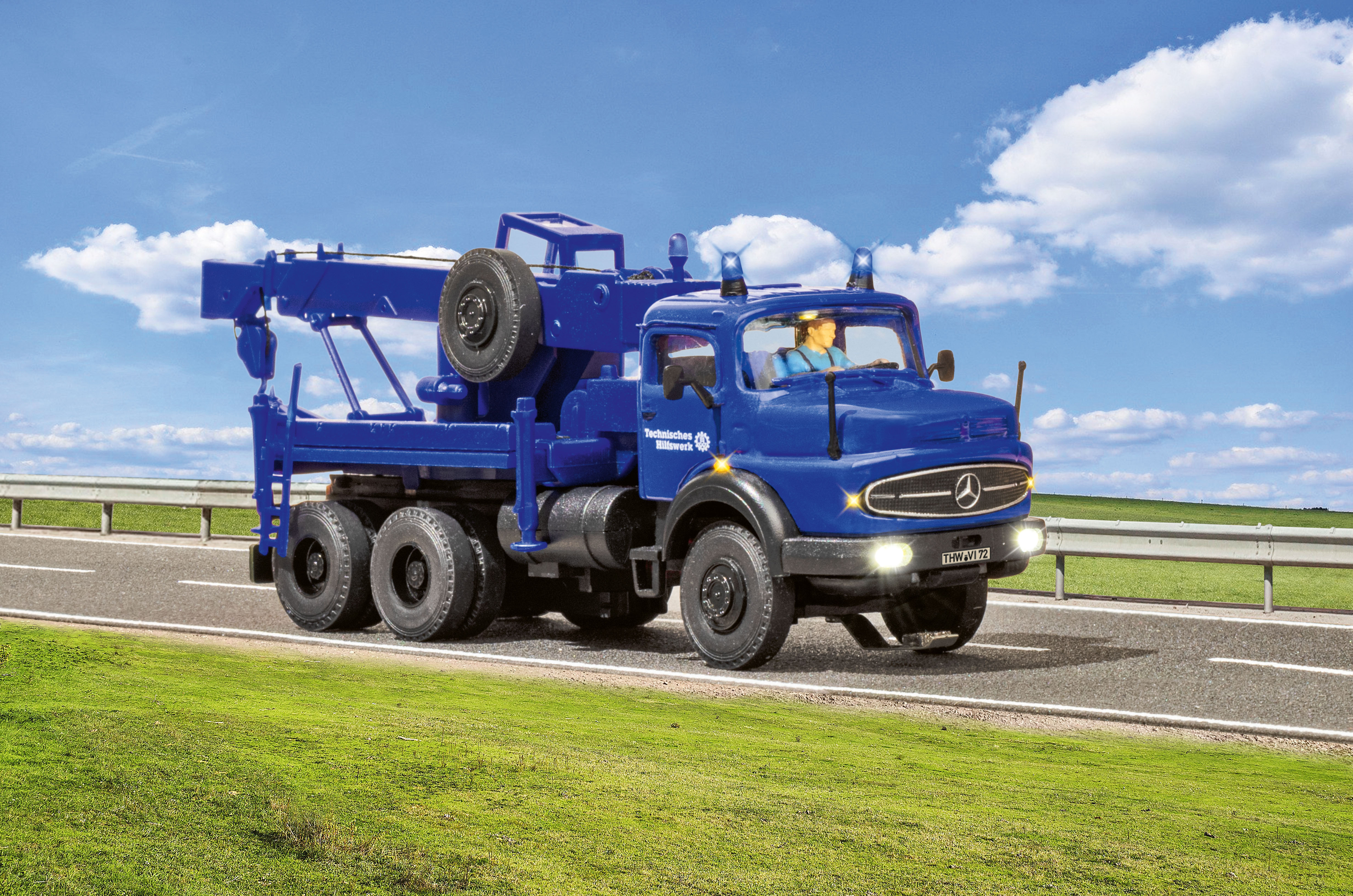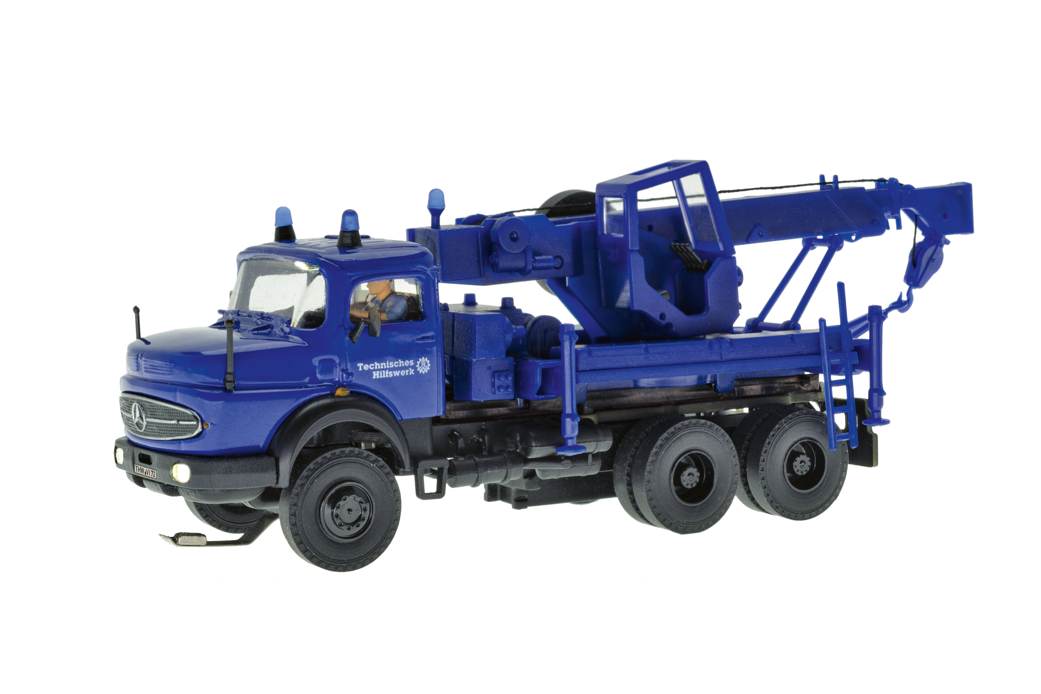 H0 THW MB Rundhauber 3-achs Bergekran mitRundumleuchten, Basis, Funktionsmodell - Wie alle Modelle der CarMotion-Serie verfügt das Fahrzeug über folgende Funktionen: - Lade- und Programmieranschluss - Kurze Ladezeiten durch moderne Li-Po Akkus - Mit einer Akkuladung ist bei normalem Fahrbetrieb mit Wartezeiten und verschiedenen Geschwindigkeiten eine Laufzeit von ca. 4 – 6 Stunden, bei Höchstgeschwindigkeit von ca. 2 Stunden möglich - Einfaches Ein-/Ausschalten mit Hilfe eines Reedkontakts unter dem Dach der Fahrerkabine mit Magnetstift oder Teleskop-Magnetstab Art. 8410 - Infrarot-Sender/-Empfänger für Abstandssteuerung (nur bedingt mit anderen IR-Systemen kompatibel) - Realistische Brems- bzw. Beschleunigungsvorgänge und konfigurierbarer Geschwindigkeit durch drehzahlgeregelten Motor - Freie Ladefläche durch Unterflurantrieb - Kabinenbeleuchtung - Bremslichter und Rückfahrscheinwerfer - Blinker rechts/links und Warnblinker steuerbar - Abblendlicht / Fernlicht - Dachblinker (abhängig vom Fahrzeugtyp) - Einsehbare Fahrerkabine mit Figur - 5-polige Steckkupplung zum Anschluss von CarMotion Anhängern oder Aufliegern - Kompatibel zu vorhandenen Systemen mit Fahrdraht oder Magnetband - Steuerung über Infrarot-Signale, Dauermagnete Art. 8431 in der Straße, elektromagnetische Stopp-Spulen und Fernbedienung Art. 8402 - Selbst ohne Spurhilfen ist eine kurze geradlinige Rückwärtsfahrt mittels Steuerung über die Fernbedienung möglich Vorbilddaten: MERCEDES BENZ LAK 2624, 177 kW/240 PS, zul. Gesamtgewicht 22 t, BILSTEIN Bergekran 12500 H, vollhydraulisch, max. Tragkraft 12 t, Hubhöhe 11 m, hydr. Bergeseilwinde. L 11 – 18 x B 3,2 – 4,3 x H 3,9 – 11,5 cm