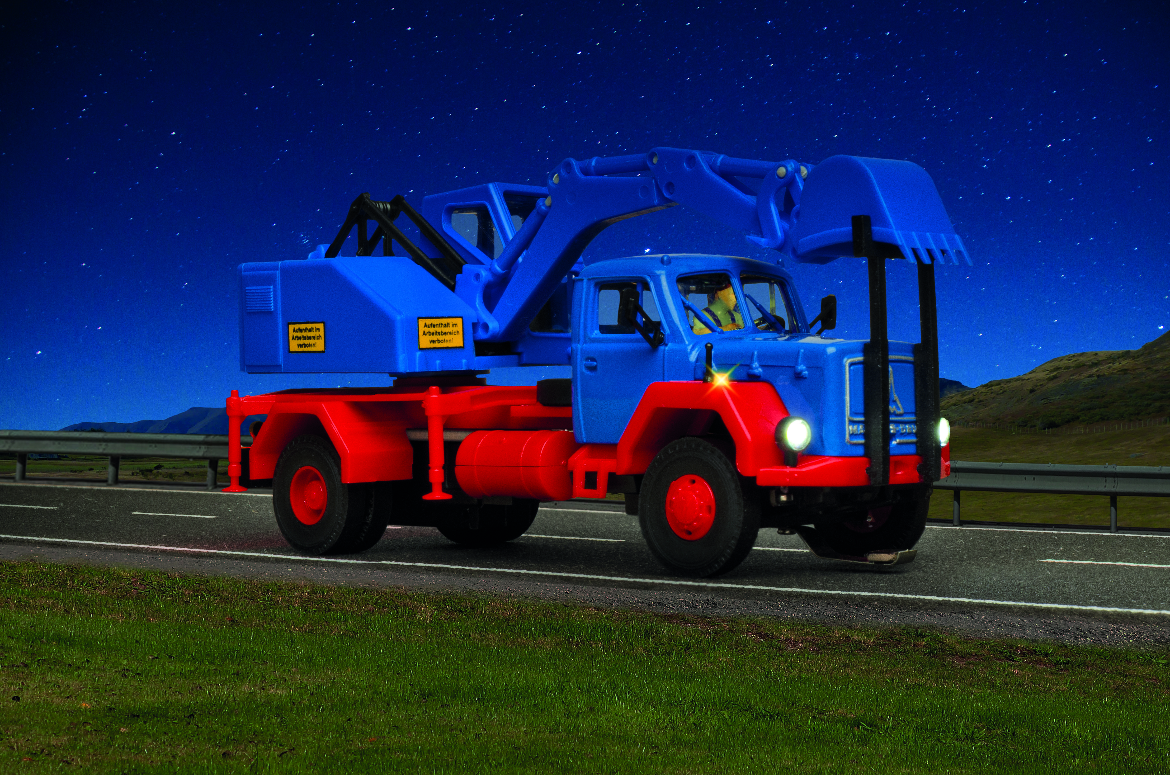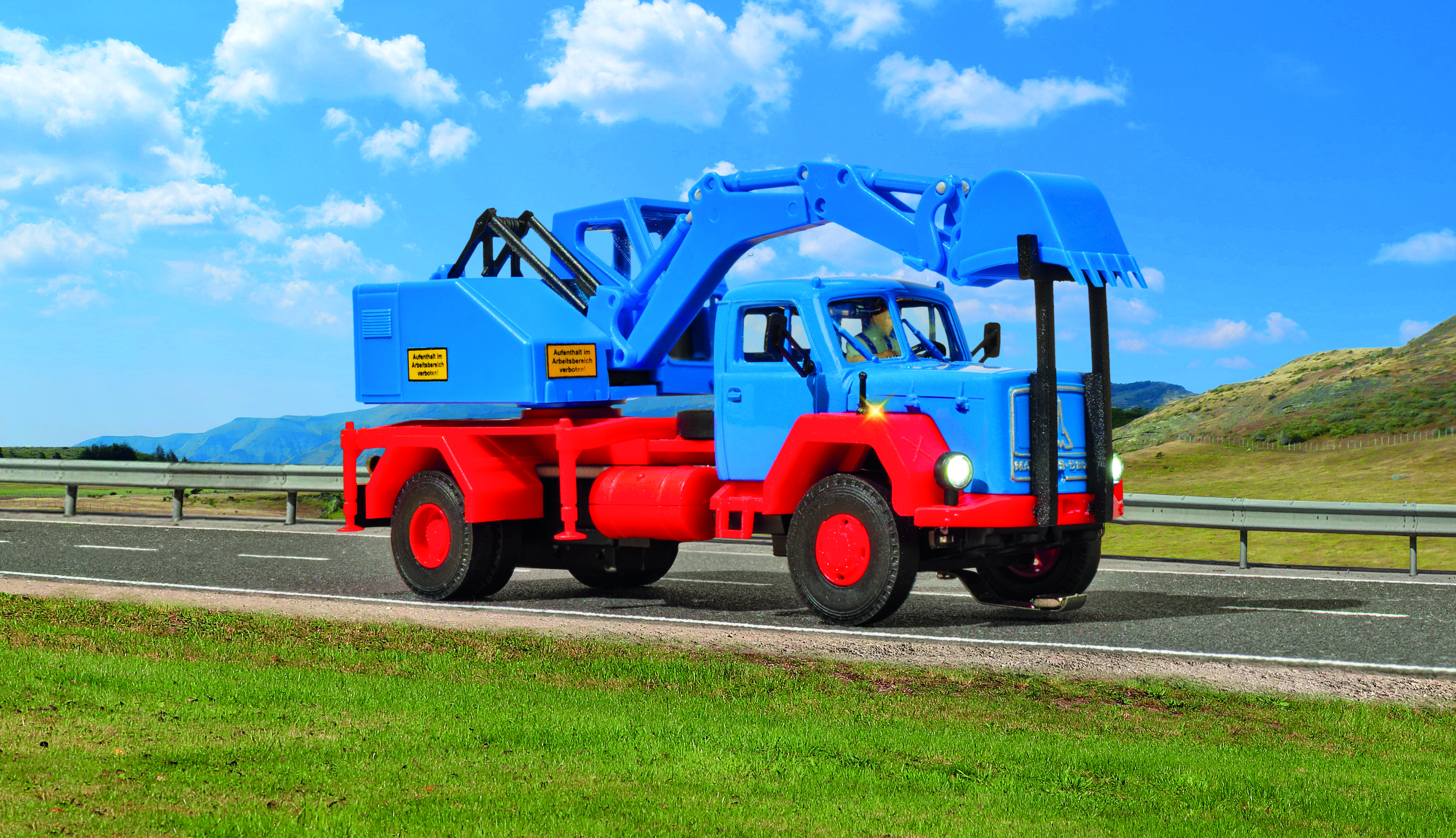 H0 MAGIRUS DEUTZ 2-achs Eckhauber mit Baggeraufbau Basis, Funktionsmodell - Wie alle Modelle der CarMotion-Serie verfügt das Fahrzeug über folgende Funktionen: - Lade- und Programmieranschluss - Kurze Ladezeiten durch moderne Li-Po Akkus - Mit einer Akkuladung ist bei normalem Fahrbetrieb mit Wartezeiten und verschiedenen Geschwindigkeiten eine Laufzeit von ca. 4 – 6 Stunden, bei Höchstgeschwindigkeit von ca. 2 Stunden möglich - Einfaches Ein-/Ausschalten mit Hilfe eines Reedkontakts unter dem Dach der Fahrerkabine mit Magnetstift oder Teleskop-Magnetstab Art. 8410 - Infrarot-Sender/-Empfänger für Abstandssteuerung (nur bedingt mit anderen IR-Systemen kompatibel) - Realistische Brems- bzw. Beschleunigungsvorgänge und konfigurierbarer Geschwindigkeit durch drehzahlgeregelten Motor - Freie Ladefläche durch Unterflurantrieb - Kabinenbeleuchtung - Bremslichter und Rückfahrscheinwerfer - Blinker rechts/links und Warnblinker steuerbar - Abblendlicht / Fernlicht - Dachblinker (abhängig vom Fahrzeugtyp) - Einsehbare Fahrerkabine mit Figur - 5-polige Steckkupplung zum Anschluss von CarMotion Anhängern oder Aufliegern - Kompatibel zu vorhandenen Systemen mit Fahrdraht oder Magnetband - Steuerung über Infrarot-Signale, Dauermagnete Art. 8431 in der Straße, elektromagnetische Stopp-Spulen und Fernbedienung Art. 8402 - Selbst ohne Spurhilfen ist eine kurze geradlinige Rückwärtsfahrt mittels Steuerung über die Fernbedienung möglich Vorbilddaten: MAGIRUS Deutz 230 D 16, 169 kW / 230 PS mit Baggeraufbau FUCHS F301 H. 1965 wurden einige F301 mit einer hydraulischen Baggereinrichtung der Firma Schaeff in Langenburg ausgerüstet, was bei der Kundschaft sehr gut ankam! In die Grundmaschine, die im Wesentlichen dem F301 entspricht, wurden eine Hydraulikanlage und ein etwas stärkerer Motor eingebaut. Ein 700 mm breiter Löffel und ein 570 mm breiter Greifer standen zur Verfügung. Passendes Nachrüst-Set Sound: Art. 8450 L 8,1 x B 3,3 x H 3,6 – 6,4 cm