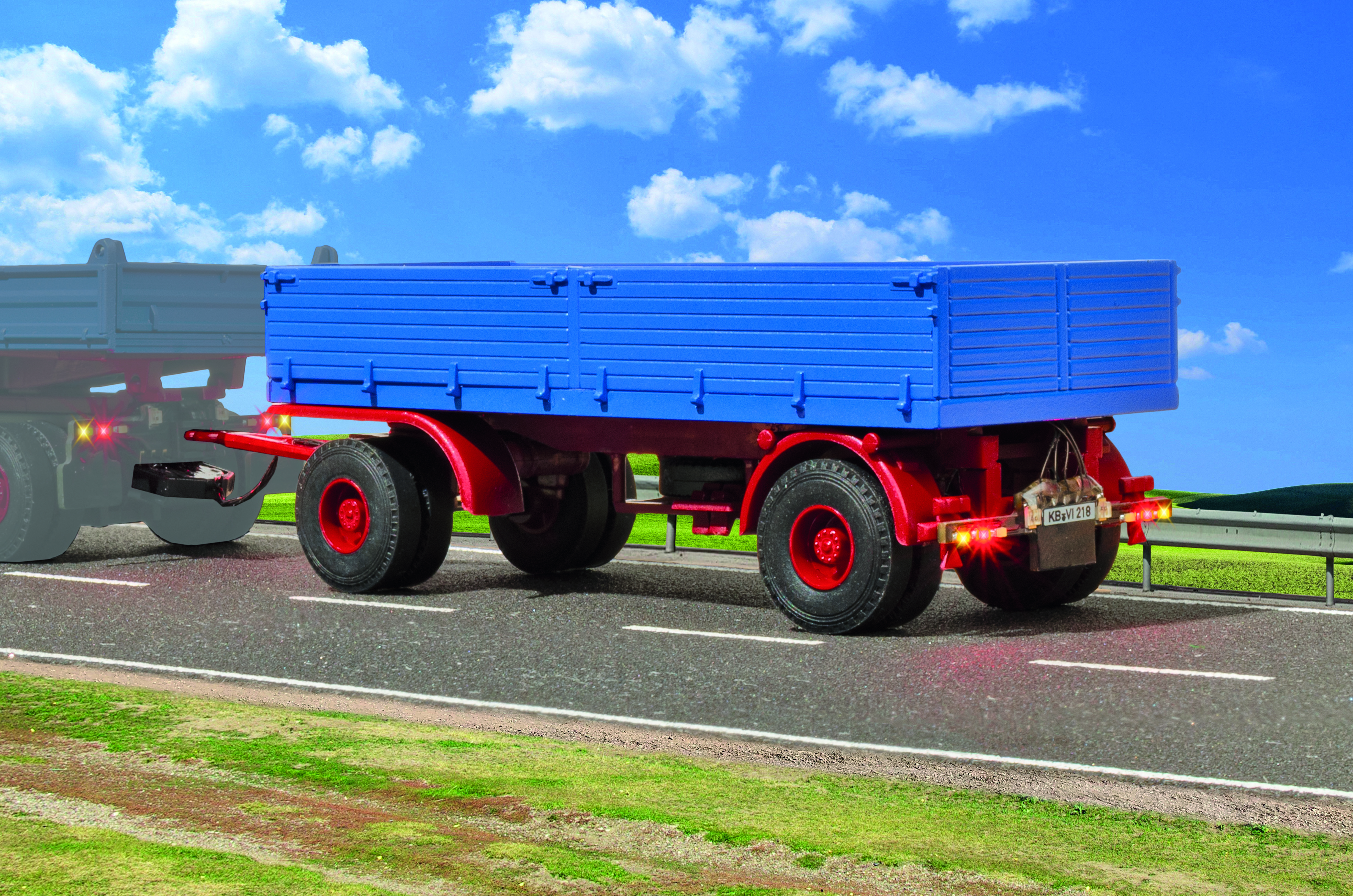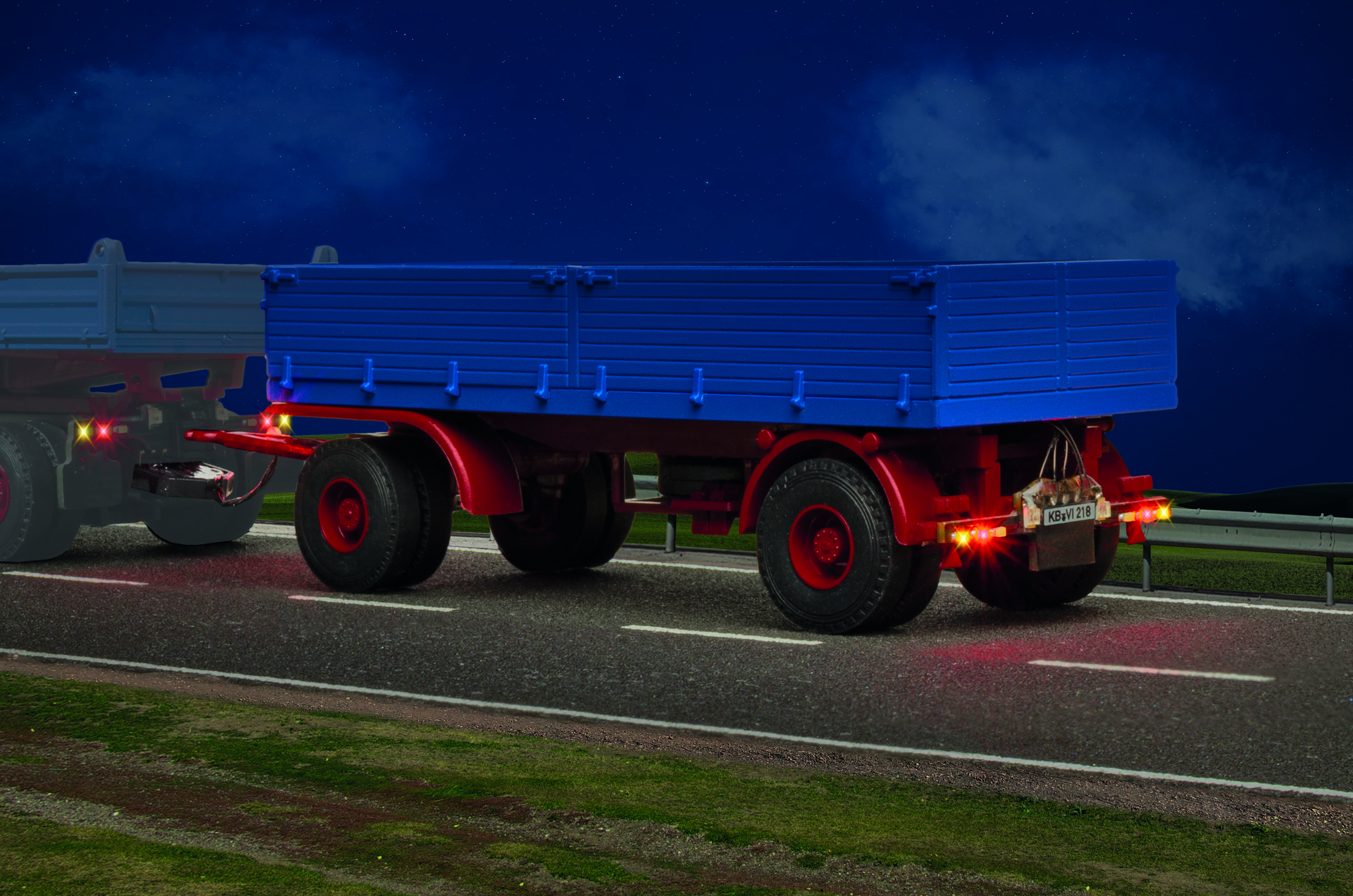 H0 2-achs Kipper mit langem Radabstand, Funktionsmodell - Der Anhänger mit rückwärtiger Beleuchtung verfügt über eine 5-polige Steckkupplung, um eine Verbindung zum jeweiligen Fahrzeug herzustellen. Durch den Anschluss an die Zugmaschine werden folgende Funktionen übertragen: • Infrarot-Sender für Abstandssteuerung • Bremslichter und Rückfahrscheinwerfer • Blinker rechts/links und Warnblinker steuerbar L 9,8 x B 3 x H 2,7 cm