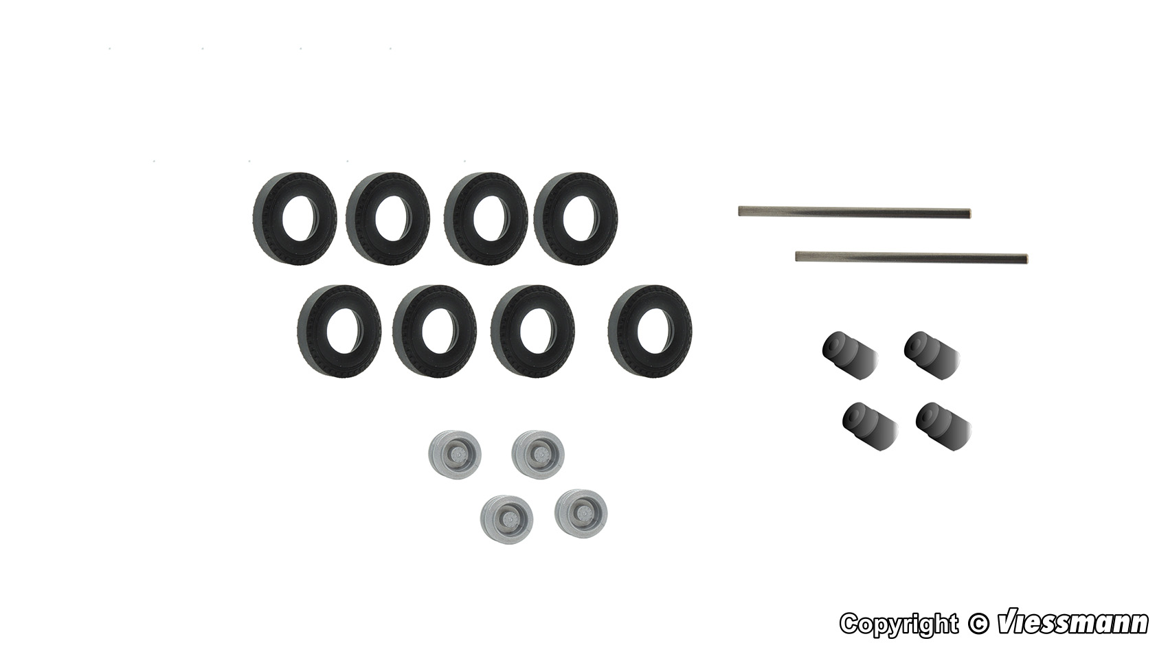 H0 Nachrüst-Set für kibri Anhänger und Auflieger,Zwillingsbereifung - Mit diesem Set können Sie Ihre kibri Anhänger oder Auflieger nachrüsten, um die Laufruhe und Spurtreue des Fahrzeugs zu optimieren. Sie verbessern dadurch die Fahreigenschaften des Anhängers bzw. Aufliegers. Inhalt: 8 Gummireifen, 4 Felgen, 2 Stahlachsen, 4 Buchsen. Geeignet für 2-achsige Anhänger und Auflieger mit Zwillingsbereifung.