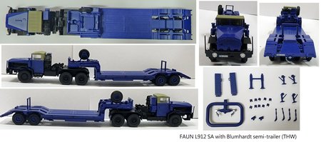Fertigmodell FAUN912SA mit Blumhardt Auflieger THW blau bzw. zivil