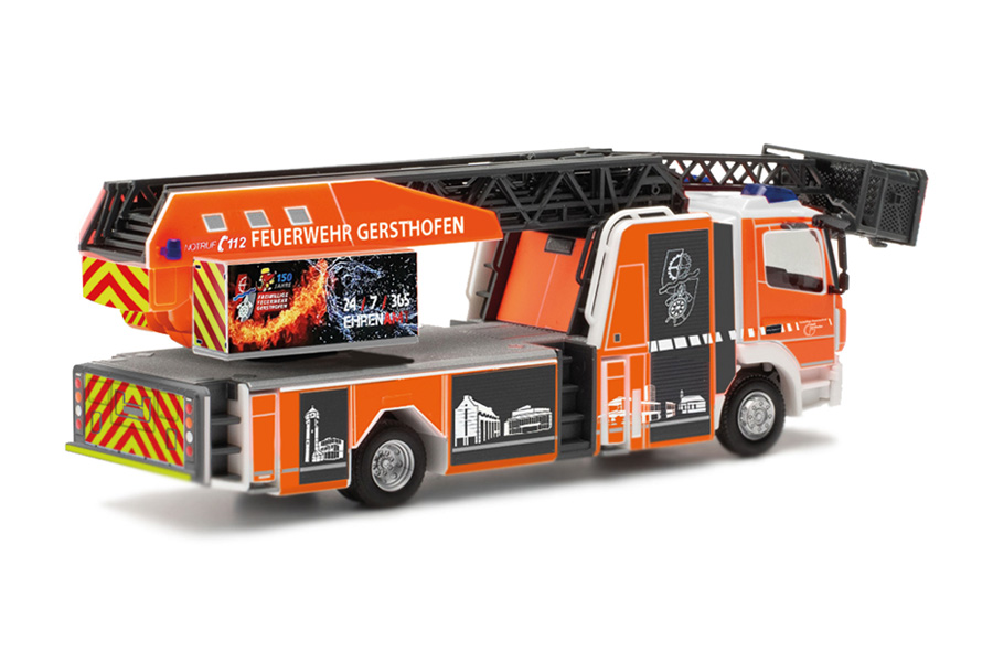 Formneuheit! Die Feuerwehr im schwäbischen Gersthofen nennt diese auffällige Rosenbauer-Drehleiter Ihr eigen. Statt dem kleinen Aggregat auf der rechten Seite des Drehleitersockels, hat sich die Feuerwehr Gersthofen hier ab Werk einen Gerätekasten verbauen lassen, der mehr Stauraum für notwendiges Gerät bietet. Dieser Gerätekasten wurde von Herpa neu umgesetzt. Das sehr aufwändige Modell erscheint in limitierter Auflage.