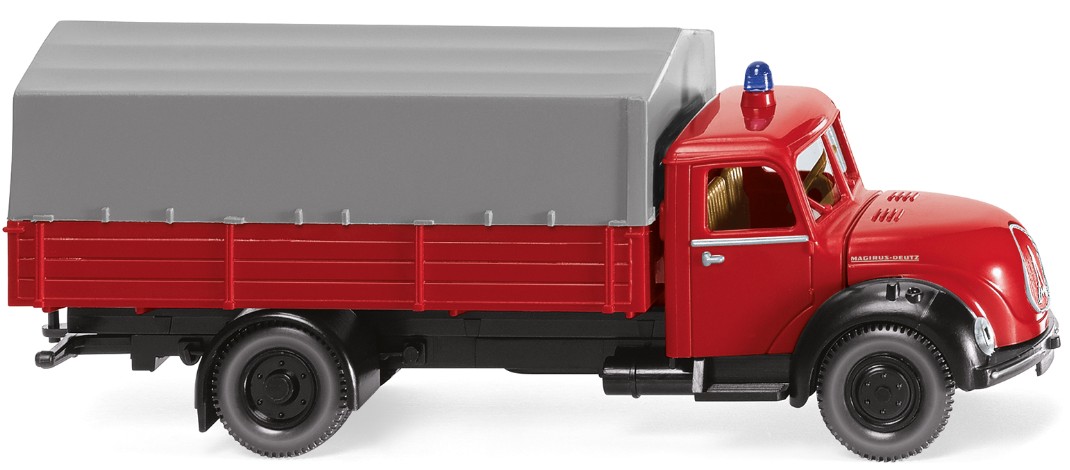 Fahrerhaus mit Motorhaube karminrot, Fahrgestell mit Kotflügeln und Spiegeln schwarz, Inneneinrichtung braun gehalten. Peilstangen als Zubehör beigelegt. Pritsche rot. Plane staubgrau gehalten. Fahrerhaus mit seitlich gesilberten Türgriffen sowie Zierleiste. Motorhaube mit Magirus-Markenzeichen und darunter Schriftzug Deutz ebenfalls silber. Felgen schwarz. Warnlicht blautransparent eingesteckt.