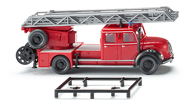 Fahrerhaus mit Motorhaube und Aufbau in rot, Kühlergrill, Fahrgestell mit Kotflügeln sowie Suchscheinwerfer in schwarz, Inneneinrichtung mit Lenkrad in rehbraun gehalten. Rückspiegel und Peilstangen als Zubehör beigelegt. Aufbauplattform rot, Stufen in silber. Leiterbock und Drehkranz rot, Drehleiterteile in silber gehalten. Felgen, Haspel, Schlauchteil sowie Spindelstützen und Leiterhalterung schwarz. Fahrerhaus mit seitlich gesilberten Türgriffen sowie Zierleisten, Winker in schwarz. Motorhaube mit Magirus-Markenzeichen und Kühlergrillbegrenzung ebenfalls gesilbert. Seitliche Schriftzüge 'Magirus Deutz' sowie frontseitige Stoßstangenzierleiste in silber.