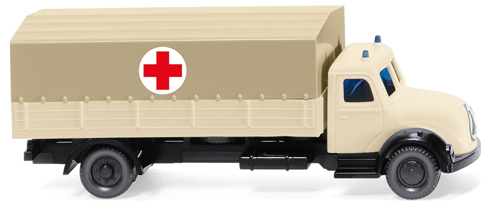 In DRK-Farben für den Katastrophenschutz gerüstet Einst hatte der Magirus-Rundhauber auch seine Aufgaben in Diensten des Deutschen Roten Kreuzes zu verrichten. Vor allem beim Aufbau des Katastrophenschutzes in den 1960er-Jahren fanden zahlreiche Lkw den Weg zu den DRK-Schwerpunktstandorten im ganzen Land. Fahrerhaus und Pritsche elfenbeinhell, Fahrgestell mit Kotflügeln und Inneneinrichtung schwarz. Verdeck cremebeige. Kühlergrill mit schwarzer Grillfläche und silbernem Rahmen sowie Magirus-Logo. Vordere Scheinwerfer silbern bedruckt. Verdeckseiten mit DRK-Logo.