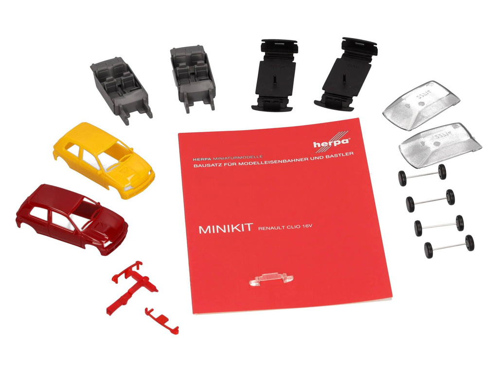 Herpa MiniKits sind original Herpa Modelle als Bausätze für Modelleisenbahner und Sammler. Der Renault Clio 16V (1991-1994) erscheint in Jaune und Rouge Etrusque. Herpa MiniKits lassen sich aufgrund der Herpa Schnappbauweise mit wenigen Handgriffen ohne Kleber zusammenbauen (Montageanleitung liegt bei). So kann die Modellanlage preiswert mit Autos bestückt oder ein Autotransportzug günstig mit PKW beladen werden. Und Airbrusher können vor dem Zusammenbau die Karosserie in der eigenen Wunschfarbe lackieren.