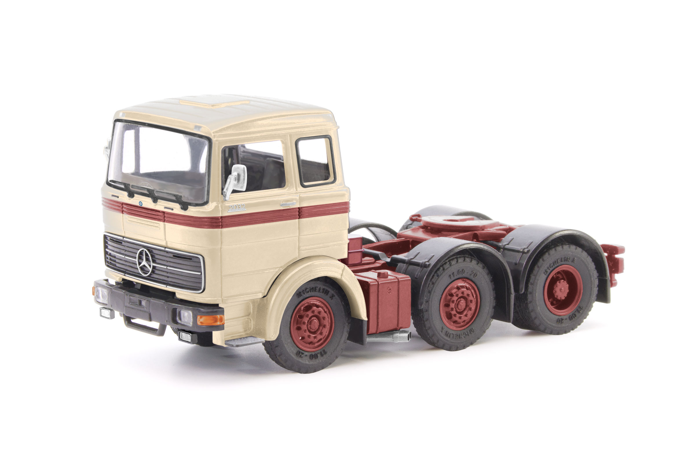 Nach der sehr schnell ausverkauften ersten Solozugmaschine des Mercedes-Benz LPS 2032 (Rekata, 87MBS026185) erscheint sie nun in beige, so wie sie damals in vielen Publikationen zu sehen war. LKW-Sammler lieben auch das Besondere, das Außergewöhnliche. Modellbau Schwarz, steht in der 1:87 Modellwelt genau dafür, feine Modelle, deren Detaillierung über das schon hohe Maß bei Herpa noch hinausgeht. Die Kubische Kabine, der LPS 2032 wurde seit 1970 mit 320 PS V10-Motor geliefert, um der StVZO-Vorgabe (ab 01.01.1972) nachzukommen, die min. 8 PS je Tonne zulässigem Gesamtgewicht forderte. Den Modellen werden Lenkungsteile zum Selbsteinbau beigelegt. Die Spedition Willi Oepen ist in Köln beheimatet und stellt das Original dieses schönen Tiefladers, der in limitierter Auflage produziert wird.