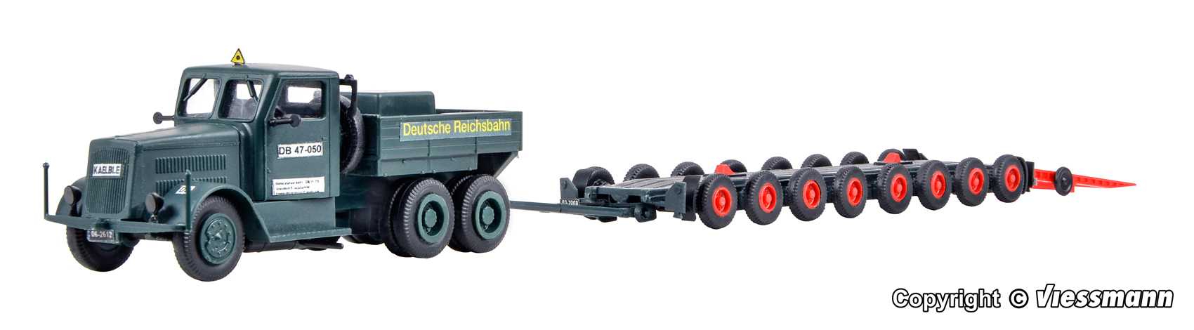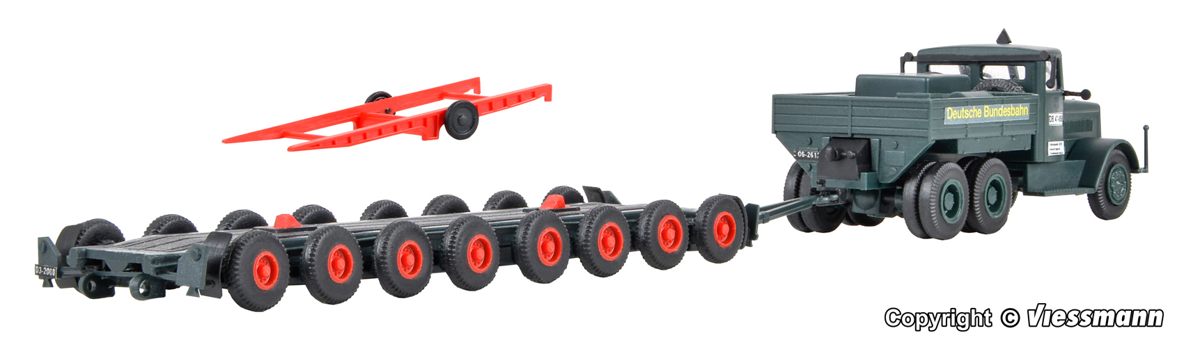 Bausatz. Vorbilddaten: KAELBLE Zugmaschine Z6W2A130, Dieselmotor 100 kW/130 PS, CULEMEYER SEAG LR 40/9, Traglast 39 t, Höchstgeschwindigkeit 42 km/h. Maße: L 22 x B 3 x H 3,2 cm. Schwierigkeitsgrad: 2 (Fortgeschrittene).