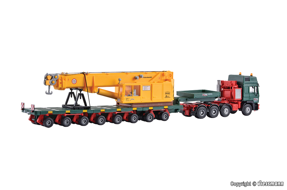 Bausatz. Moderne Schienenkräne werden auf der ganzen Welt eingesetzt, meist beim Bau und Erhalt der örtlichen Bahnstrecken, häufig aber auch bei Unfallbergungen. In weit entfernte Länder gelangen diese zu den Bahndienstfahrzeugen gehörenden Kräne in aller Regel auf dem Seeweg. Wegen ihres hohen Dienstgewichtes von deutlich über 100 t werden sie meist geteilt in Ober- und Unterwagen zum Hafen transportiert und erst am Bestimmungsort wieder zusammengefügt. Dieses Fahrzeug transportiert den Oberwagen. Der Unterwagen wird vom Art. 13601 transportiert. Das Modell ist mit hochwertiger Tampon-Bedruckung versehen. L 26 x B 3,5 x H 4,5 cm. Schwierigkeitsgrad: 2 (Fortgeschrittene).