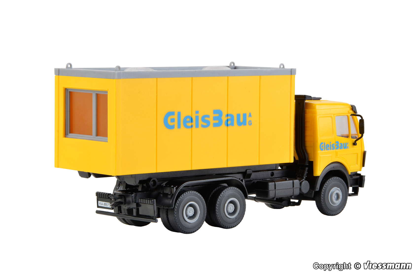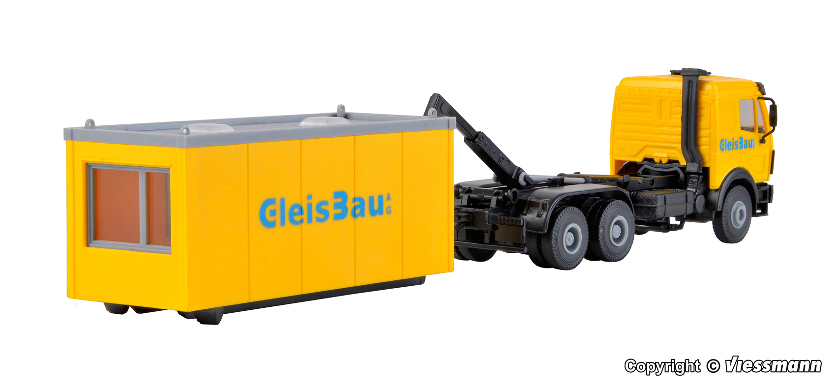 Bausatz. Mobile Bürocontainer werden auch auf größeren Gleisbaustellen benötigt. Mit diesem Wechsellader können Container für verschiedene Einsatzzwecke transportiert werden. Das Modell ist mit hochwertiger Tampon-Bedruckung versehen. Maße: L 10,5 x B 3,5 x H 5 cm. Schwierigkeitsgrad: 2 (Fortgeschrittene).