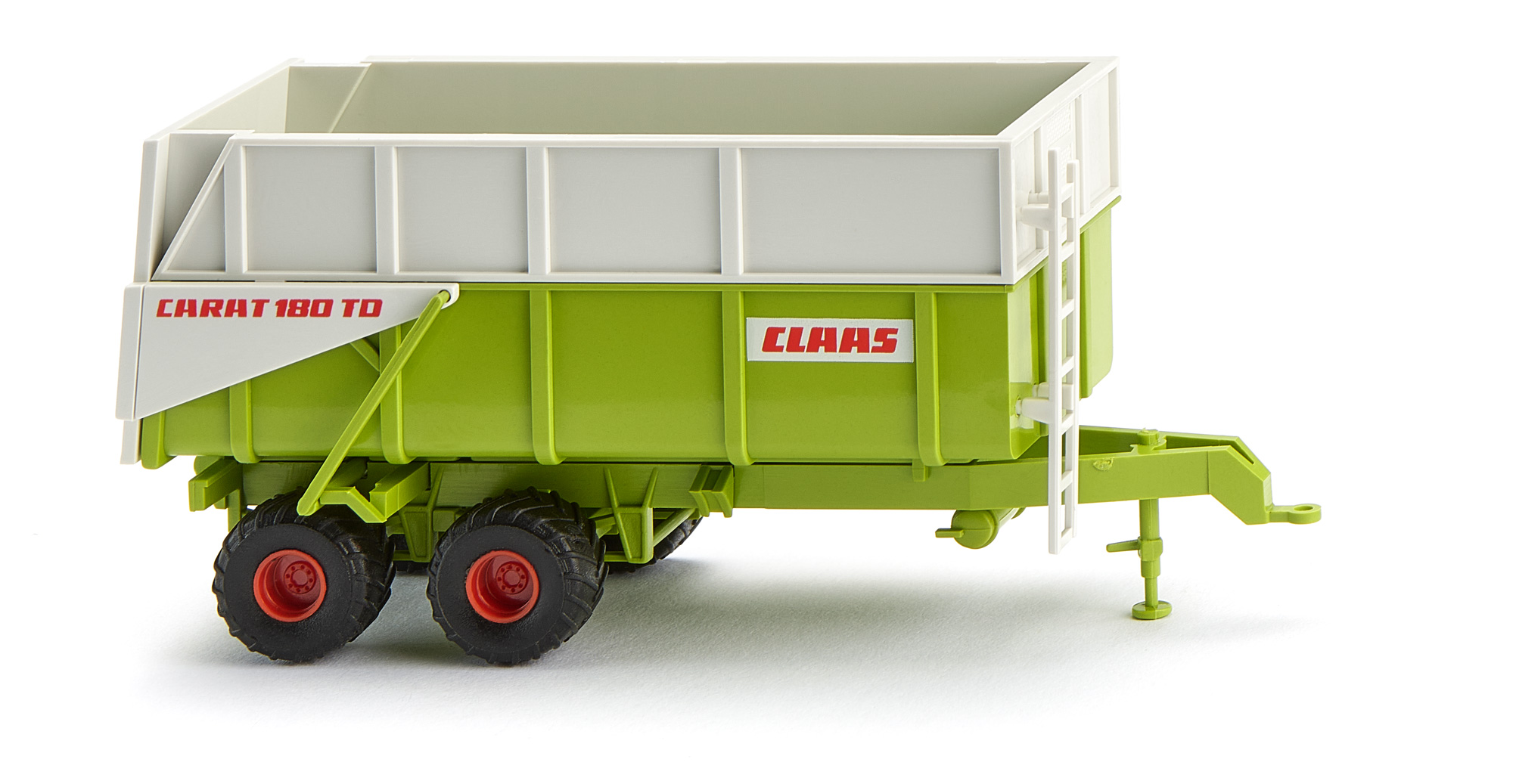 Claas-Muldenkipper mit niederländischen Genen Der Claas Carat 180 TD mit seinem 18-Tonnen-Gesamtgewicht war in den Neunzigerjahren das Ergebnis der langen Zusammenarbeit der niederländischen Landmaschinenfirma Kamps de Wild aus Zevenaar mit den Harsewinkeler Ernteexperten. Die Niederländer kannten sich aus im Bau von Muldenkippern für den harten landwirtschaftlichen Einsatz, der in den Neunzigerjahren gerade angesichts wachsender Volumina einen Bedeutungszugewinn erfuhr. So fuhren baugleiche Muldenkipper sowohl von Kaweco als auch Claas auf die landwirtschaftlichen Höfe. WIKING-Freunde werden sich daran erinnern, dass der Claas-Ladewagen bei seiner Vorstellung vor 30 Jahren zu den ersten Großmodellen im landwirtschaftlichen Programm der Traditionsmodellbauer gehörte. Fahrgestell mit Bügel, Zylinder und Stützfuß sowie Kippmuldenunterteil in claasgrün. Muldenaufsatz und Leiter grauweiß. Felgen rot. Beidseitig roter Muldendruck mit Markenschriftzug Claas sowie Typenangabe Carat 180 TD. Heckseitig roter Claas-Schriftzug und karminrot bedruckte Rückleuchten.
