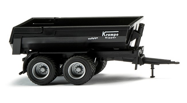 Black is beautiful auch beim Halfpipe-Muldenkipper Längst gibt es im Landmaschinenbau kein Farbtabu mehr Black is beautiful. Und so erscheint der Krampe Halfpipe Muldenkipper im attraktiven Schwarz! Die Großflächenlandwirtschaft, der Tiefbau, aber auch Landschaftsbau und Kommunalbetriebe setzen immer öfter auf die Halfpipe-Konstruktion von Krampe. WIKING realisierte den HP20, der als funktionelle Miniaturisierung eine sinnvolle Bereicherung facettenreicher Themenfelder im Maßstab 1:87 bedeutet. Nach dem Motto Qualität auf Rädern produziert das münsterländische Unternehmen Krampe aus Coesfeld-Lette bereits seit 1983 Wannenkipper für die Land- und Forstwirtschaft, die Bauindustrie sowie für Kommunal- und Landschaftsbaubetriebe. Die Halbrundmulde übernahm Krampe aus dem Lkw-Bereich als durchaus formal harmonisch konzeptionierte Konstruktion. Durch den Wegfall der Längs- und Querträger hat die Halfpipe ein niedrigeres Eigengewicht im Vergleich zur herkömmlichen Kippmulde. Dies erhöht die Nutzlast des Fahrzeuges das zulässige Gesamtgewicht liegt beim Vorbild bei 20 Tonnen. Die Vorteile im Alltagsbetrieb sind augenfällig: Das Schüttgut rutscht bei der Verladung in einem flacheren Winkel über die Muldenwand. Beim Transport von dicken Brocken wie Findlingen wird die Ausbeulung der Mulde verhindert. Die runde Muldenform verhindert überdies in den Muldenecken verbleibende Schüttgüter. WIKING bildete die Hydraulikzylinder an der Stirnwand der Halbrundmulde ebenso vorbildgerecht nach wie die übrigen Details von Fahrgestell und Mulde. Damit ist abermals ein Höchstmaß an Funktionalität in 1:87 gewährleistet. Mulde schwarz. Fahrgestell, Deichsel, Standfuß schwarz, Silberne Felgen, schwarze Kotflügel. Weiße Typenbedruckung Krampe Kipper Halfpipe.