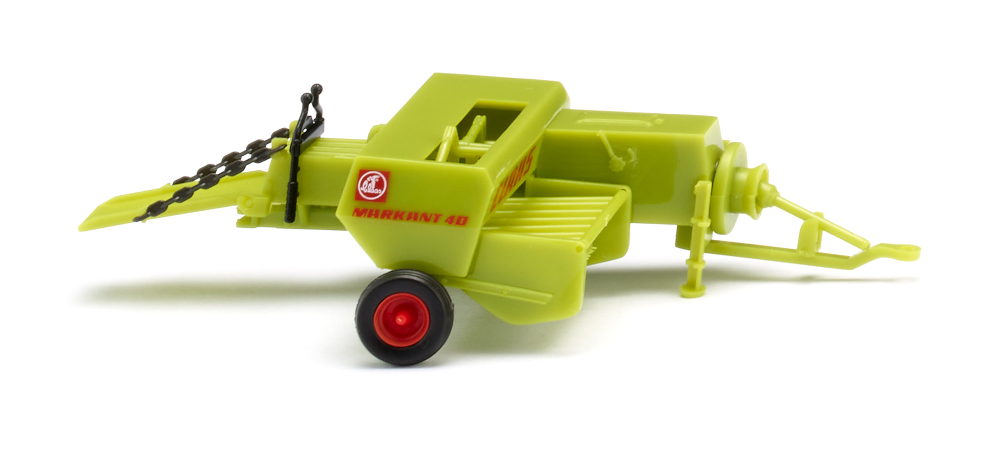 Fahrgestell und Pressenaufbau in claasgrün, Strohaufnahme und Ballenauswurf ebenfalls in claasgrün gehalten. Felgen in rot. Linksseitig rotes Claas-Logo und "Markant 40"-Schriftzug, vorder- und rückseitig ebenfalls roter Claas-Schriftzug.