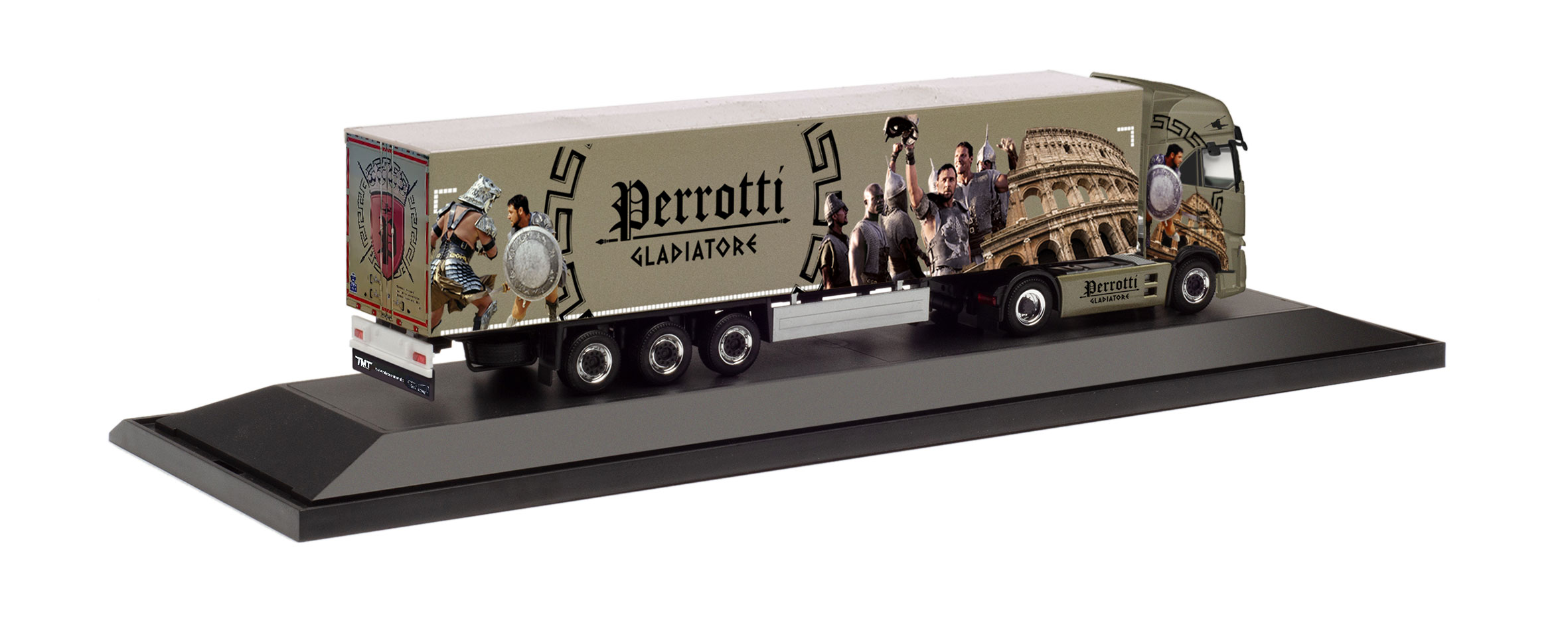 Als stets kämpfende Gladiatoren sieht Michele Perrotti aus Lucera in Italien seine Fahrer. Einen seiner sechs neuen Iveco S-Way hat er samt Schubboden-Auflieger mit entsprechenden Motiven gestaltet. Dieser neue Iveco S-Way dient somit als Vorbild für das erste Truck-Highlight mit der neuen Iveco-Zugmaschine und wird von Herpa als Modell in der bekannten Vitrine ausgeliefert.