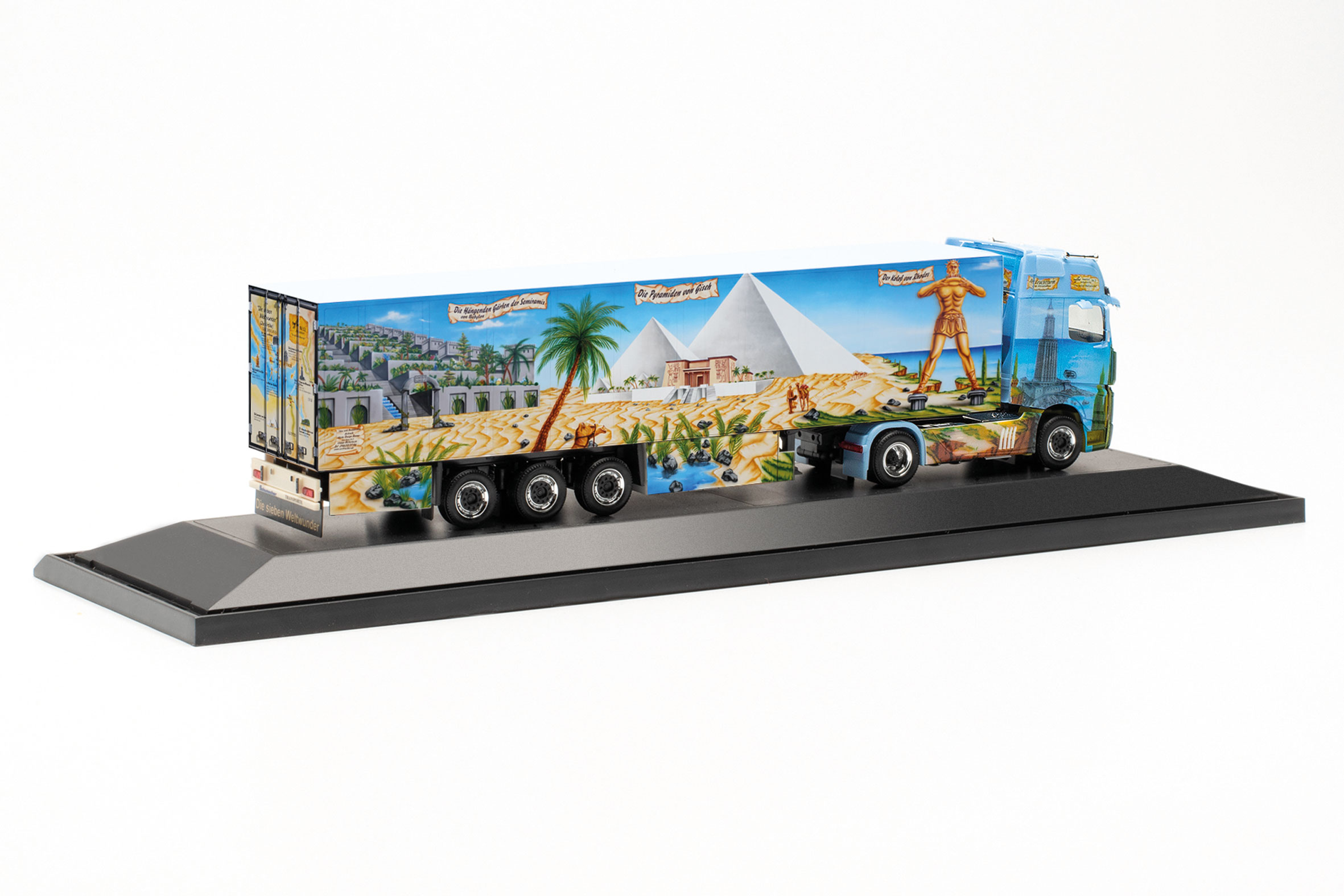 Nachdem der Herpa-Weltgeschichte-Truck Nr. 3 zur Spedition Schumacher wechselte, wurde die DAF-Zugmaschine durch einen Mercedes-Benz Actros ersetzt. Nun hat die Spedition Schumacher den Auflieger ersetzt, der mittlerweile 18 Jahre gute Dienste verrichtet hatte. Walter Rosner hat die Motive der Weltwunder der Antike neu interpretiert und auf den jeweils anderen Kofferseiten neu angeordnet.