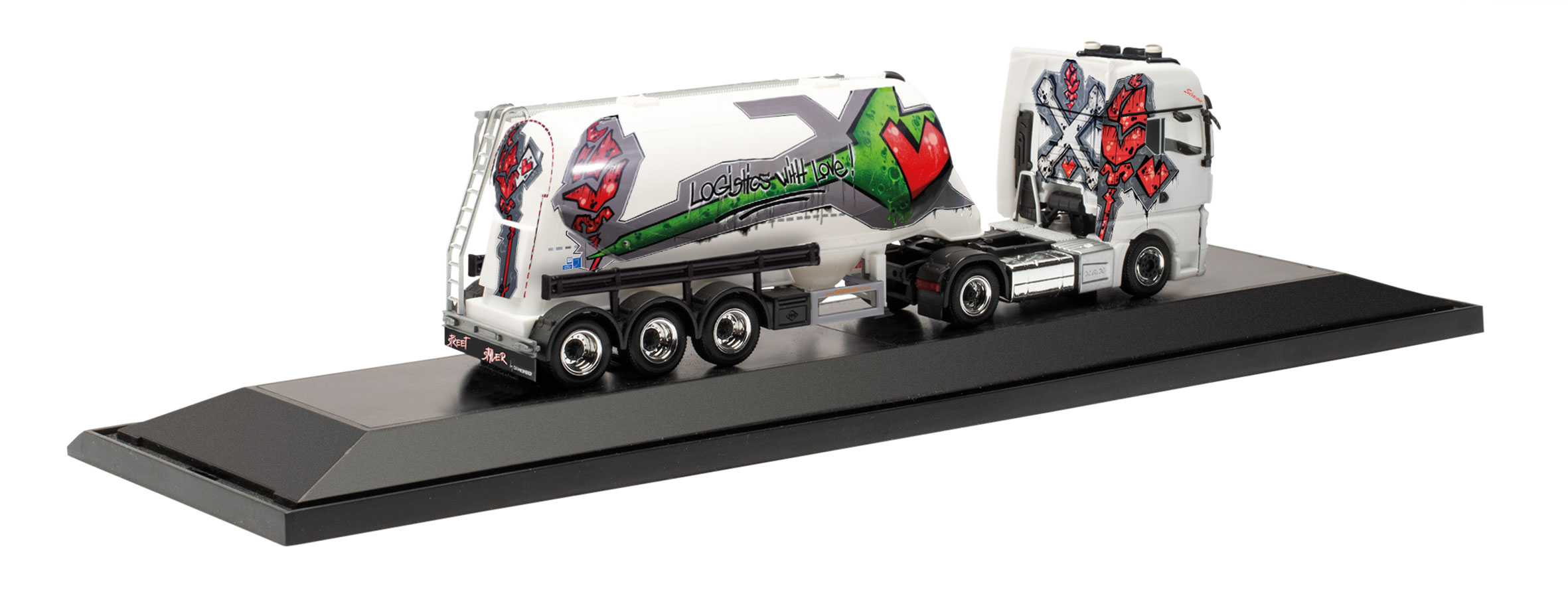 Neu im Fuhrpark der Spedition Denkinger aus Ehingen ist dieser mittels Graffitti gestaltete Eutersilo-Sattelzug, der mit einer aktuellen MAN TGX GX Zugmaschine ausgestattet ist. Durch mehr als 60 Einzeldrucke wird aus dem weißen Sattelzug dieses beeindruckende Truck-Highlight bei Herpa.