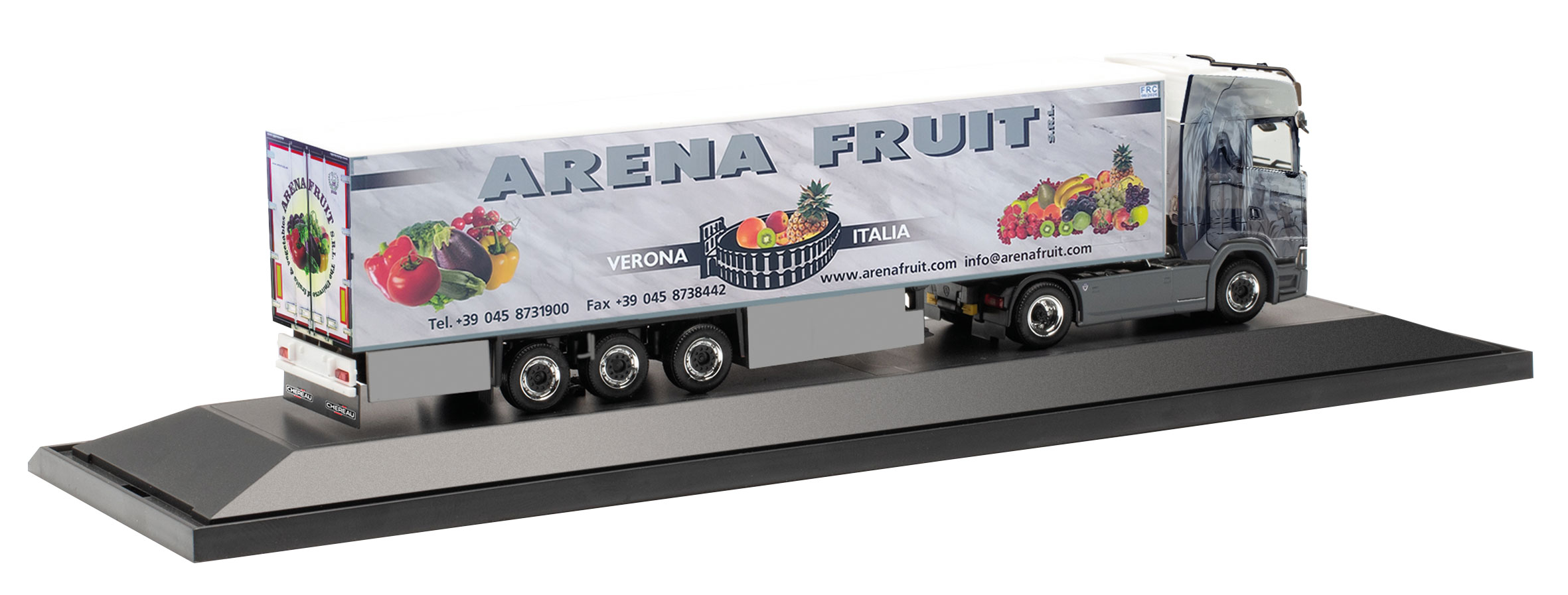 Arena Fruit S.r.l. befindet sich süd-östlich von Verona im kleinen Ort Campagnola. Arena Fruit ist Spezialist für gemischte Obst- und Gemüseladungen und garantiert die Lieferung der Waren an deutsche Großmärkte maximal 48 Stunden nach deren Ernte. Die Produktpalette umfasst über 170 verschiedene Sorten von Obst, Gemüse, Kräuter, Salate und auch Pilze. Der airbrushlackierte Scania mit Dark Angel-Motiv ist das Aushängeschild des Fuhrparkes. Das Aufliegerdesign erweckt den Anschein des italienische Marmors, der bekanntlich für große Qualität steht.