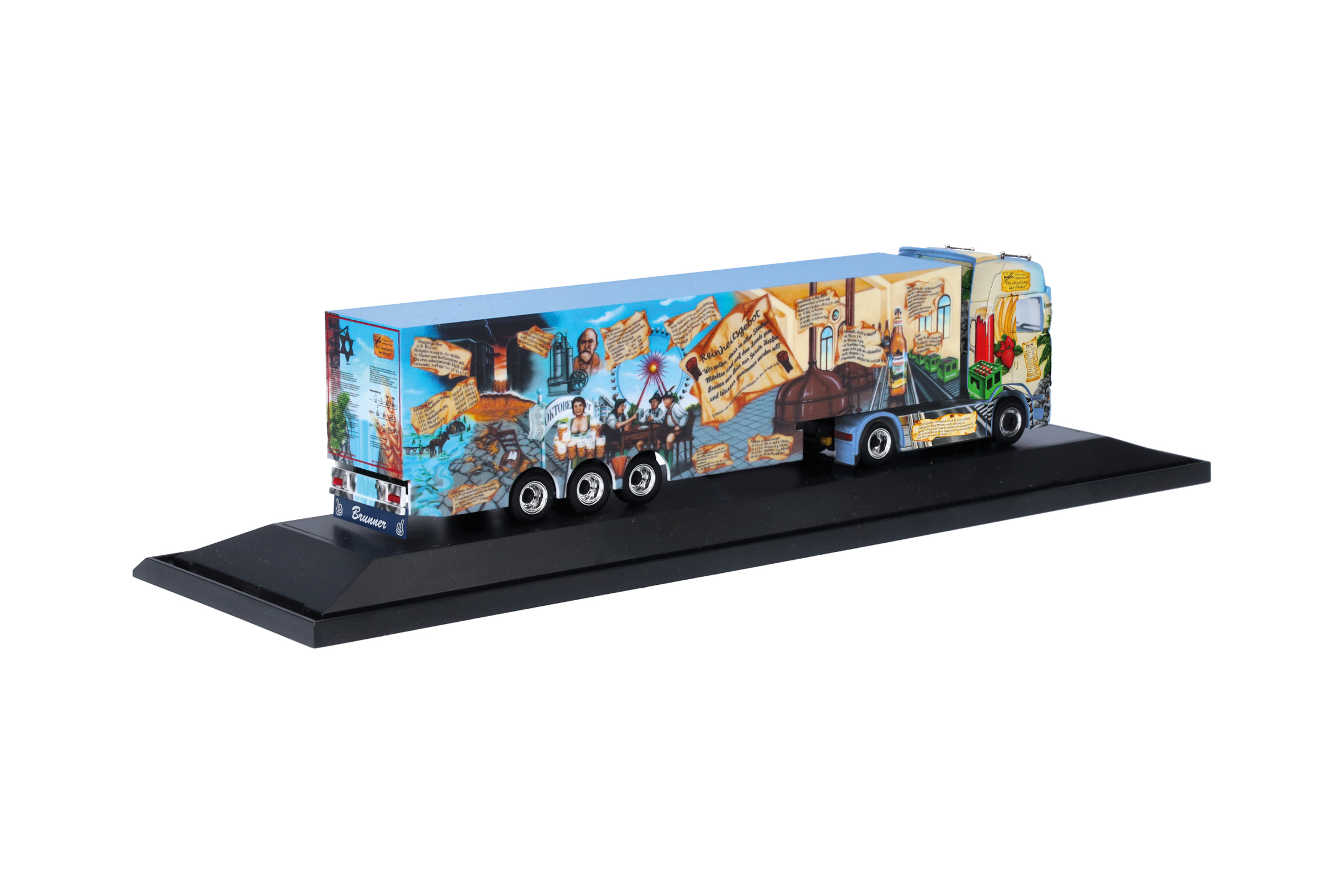 Patrick Brunner aus Heideck setzt von Beginn an den von Walter Rosner lackierten Herpa Showtruck Nummer 15 im Tagesgeschäft ein. Nachdem die DAF XF Zugmaschine nun ersetzt werden musste wurde ein neuer Scania CS 20 mit Hochdach geordert, den Walter Rosner im Auftrag von Herpa und PB-Transporte erneut lackierte und dem Auflieger anpasste. Das ist Grund genug für Herpa diesen beeindruckenden Truck unter der Nummer 15.1 als Miniaturmodell nochmals in kleiner Auflage zu produzieren.