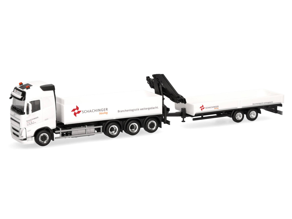 Das Familienunternehmen Schachinger Logistik ist eines der führenden Speditionsunternehmen Österreichs. Viele verschiedene Transporteinheiten für mannigfache Güter stehen dabei zur Verfügung. Täglich sind mehr als 500 Mitarbeiter im Einsatz und koordinieren Frachten. Rund 200.000 m2 Lagerflächen in Österreich, Tschechien, Slowakei und Ungarn ermöglichen viel Umschlag. Eine wohl eher exotischere Kombination ist dieser 4achs Volvo mit Pritsche und Ladekran, dem ein Niederflurpritschenhänger angekoppelt ist.