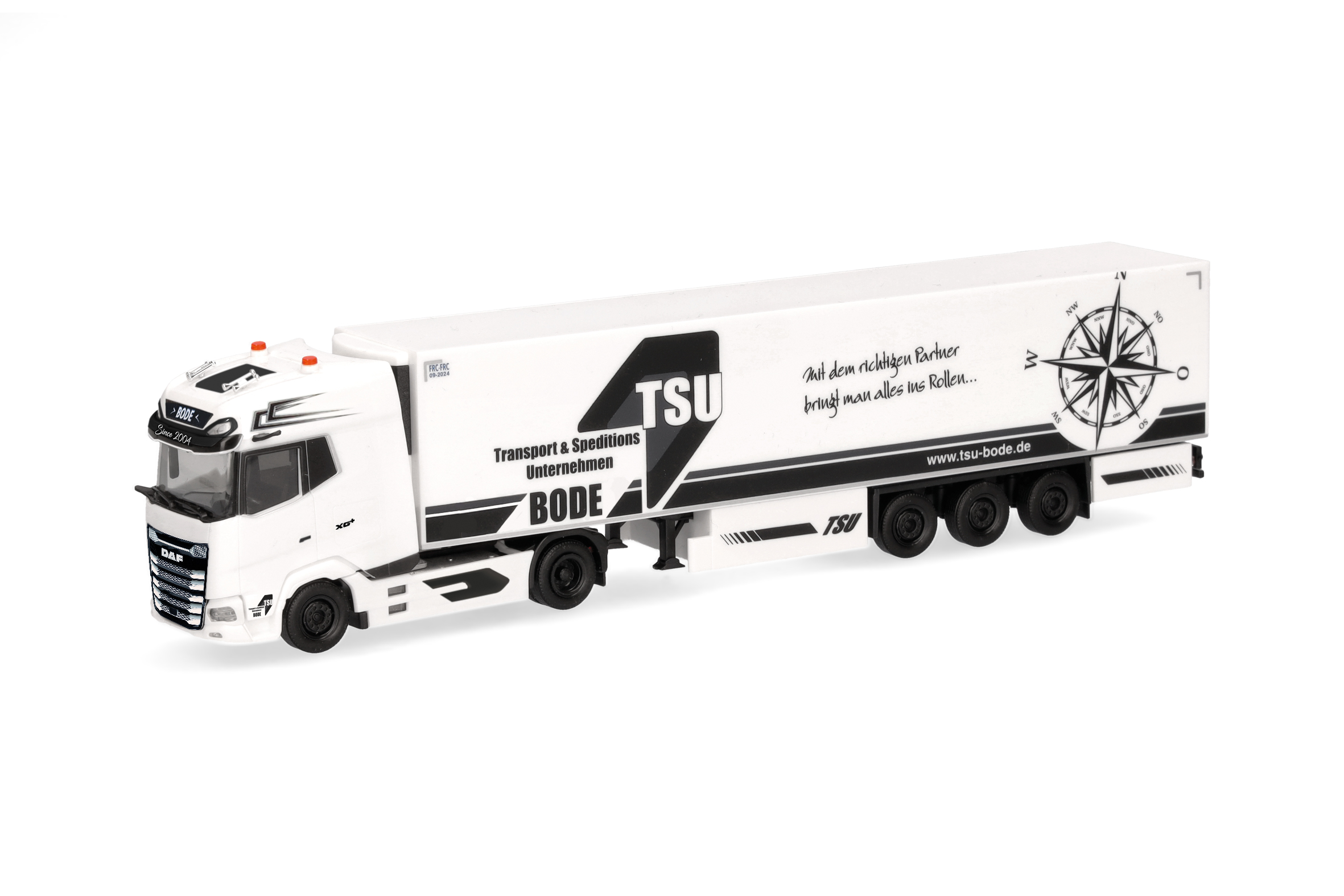 TSU Bode ist mit seinem modernen und schön gestalteten Fuhrpark seit vielen Jahren in den Herpa-Neuheiten vertreten. Nach der Umfirmierung zur TSU Bode GmbH wurde auch dieser neue DAF XG+ mit Auflieger neu beschriftet, Grund genug die Serie der TSU-Bode-Modell fortzuführen.