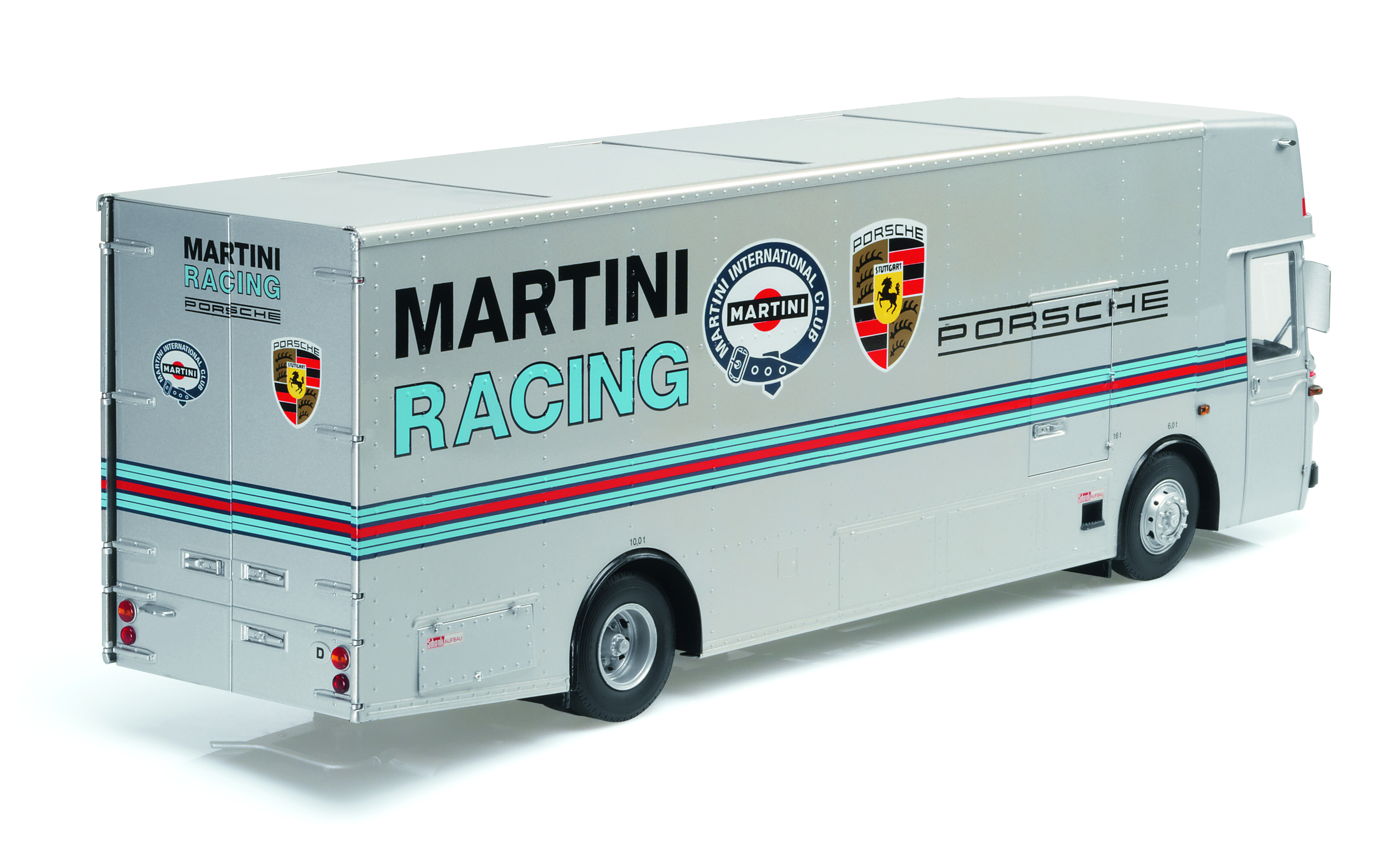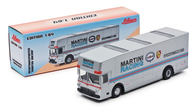 Der Renntransporter wurde von der Karosseriefabrik Schenk auf dem Chassis des Mercedes Benz O 317 aufgebaut. Im Einsatz für die Porsche-Flotte war dieses Gefährt ab 1970 in rot-lackierter Porsche Ausführung und anschließend im neuen Design, als Martini Racing Transporter. In der Edition 1:64 von Schuco sind die legendären Transporter als hochwertig detailgetreue Nachbildungen erhältlich. Schuco setzt in dieser Bau reihe historische Serien- und Rennsportfahrzeuge, aber auch Traktoren und Nutzfahrzeuge mit äußerster Genauigkeit um. Mit Vorbildmodellen weltweit bekannter Herstellernamen wie Porsche, Volkswagen und vielen anderen ist es möglich, stets herausragende und sehr interessante Modellneuheiten zu realisieren.