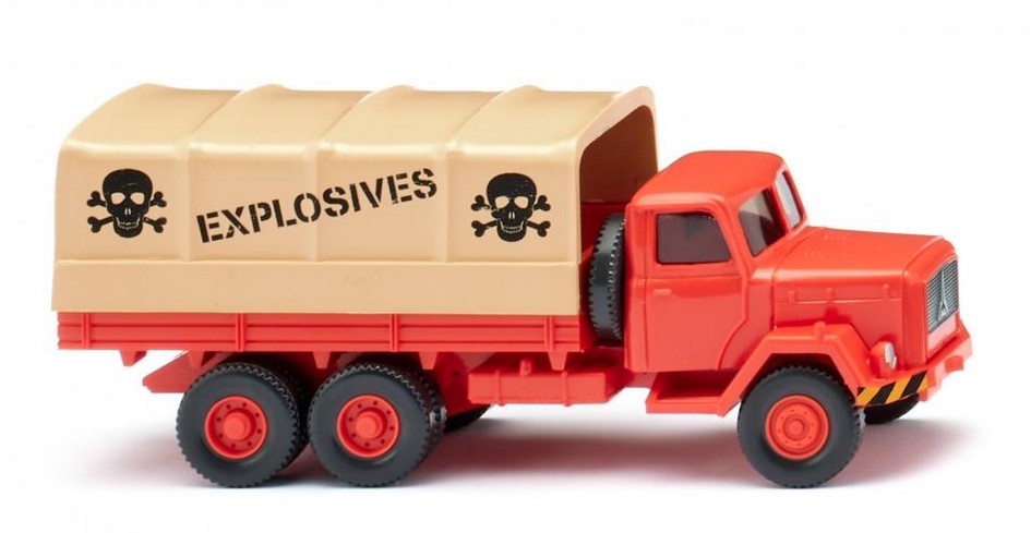 Mit luftgekühltem Heuler und explosiver Fracht unterwegs In den Wirtschaftswunderjahren gab es für Sprengstofftransporte vielfältige Einsatzzwecke - ganz gleich ob beim Autobahn- oder Tunnelbau. WIKING miniaturisiert den dreiachsigen Magirus Eckhauber mit Plane und zeitgenössischer Gestaltung. Der Lkw aus Ulmer Produktion mit dem einst donnernden, luftgekühlten Deutz-Motor steht für eine ganze Generation von Lastwagen und prägte in den Nachkriegsjahrzehnten das Straßenbild Deutschlands. Fahrerhaus mit Fahrgestell, Kardanwelle, Felgen und Pritsche leuchtrot. Plane beige mit seitlichen Gefahrgut-Zeichen sowie Schriftzug für Explosionsgefahr. Vordere Stoßstange sowie heckseitige Pritschenbedruckung mit schwarzgelber Warnschraffur.