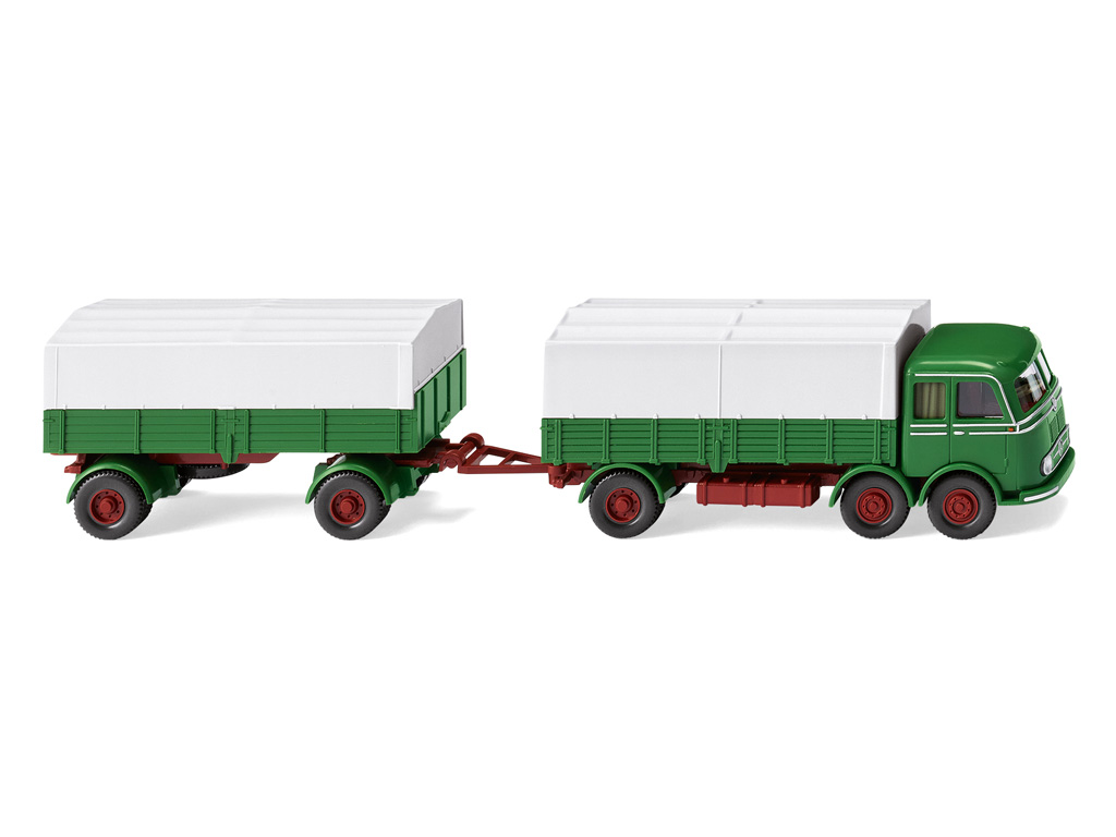 Günstige Achslastverteilung war nur ein kurzer Vorteil WIKING hat der Pullman-Generation ein modellbauerisches Denkmal gesetzt ganz vorn der Mercedes-Benz LP 333 mit doppelter Vorderachse. Der Tausendfüßler von Mercedes-Benz markiert den Beginn der logistischen Wertschätzung von Frontlenker-Lkw, die seinerzeit weit hinter den Haubern zurücklagen. Schon in den sechziger Jahren hatten sich die Traditionsmodellbauer allein für die Pullman-Zugmaschine mit kurzer Kabine entschieden, WIKING hatte dann 2019 auf Basis historischer Muster des legendären Modellbaumeisters Alfred Kedzierski nachgelegt und den Tausendfüßler mit Fernverkehrskabine miniaturisiert. Mercedes-Benz hatte den ungewöhnlichen Lkw mit doppelter Vorderachse zum Ende der 1950er-Jahre als Notlösung aufgrund der Seebohmschen Gesetze gebaut. Nur durch die dritte Achse war es möglich gewesen, einen Lkw mit einem zulässigen Gesamtgewicht von 16 Tonnen zu bauen. 1960 wurde das zulässige Gesamtgewicht für zweiachsige Lastwagen dann wieder von 12 auf 16 t erhöht. Deshalb lief der LP 333 nur von 1958 bis 1961 vom Band. Es entstanden insgesamt 1833 Fahrzeuge, 354 davon im letzten Produktionsjahr. Fahrerhaus und Pritsche sowie Kühlergrill grasgrün mit gesilbertem Zierrat. Inneneinrichtung rubinrot. Scheinwerfer per Hand gesilbert. Lenkrad hellelfenbein eingesetzt. Fahrgestell mit Kardanteil und Felgen oxidrot, Stoßstange mit Doppelkotflügel grasgrün. Verdeck lichtgrau. Anhänger mit oxidrotem Fahrgestell, grasgrüner Pritsche und lichtgrauem Verdeck. Einlegeboden grasgrün, Felgen oxidrot. Fahrerhaus mit gesilberten Zierleisten und Türgriffen sowie orangen Blinkern. Rückleuchten rot bedruckt.