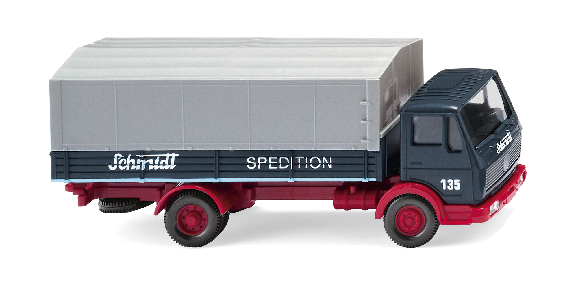 Ernst Schmidt gründete 1893 in Gevelsberg den gleichnamigen Speditionsbetrieb. Zunächst 1953 in Hamburg, dann 1954 in Bremen wurden die ersten Niederlassungen eröffnet. Die ersten Export-Sammelverkehre nach Europa und in den Nahen Osten erfolgten Mitte der sechziger Jahre. Der Fuhrpark darunter der Büssing BS 16 und die MAN Pausbacke umfasste schon in den achtziger Jahren rund 70 Fahrzeuge. Fahrerhaus sowie Pritsche graublau. Kotflügel und Fahrerhausunterteil sowie Fahrgestell mit Kardanwelle, aber auch Felgen karminrot. Silberner Kühlergrill, darunter gesilberte Frontscheinwerfer. Pritscheneinleger silbergrau, Inneneinrichtung schwarz. Fenstergraue Planen. Fahrzeugnummer 135 an den Fahrerhausseiten. Fahrerhaus Front mit Schriftzug Schmidt, Pritschenseiten mit Schriftzug Schmidt Spedition sowie darunter laufender Streifen in hellblauer Optik. Heck mit Schriftzug Schmidt und darunter laufenden hellblauen Streifen.