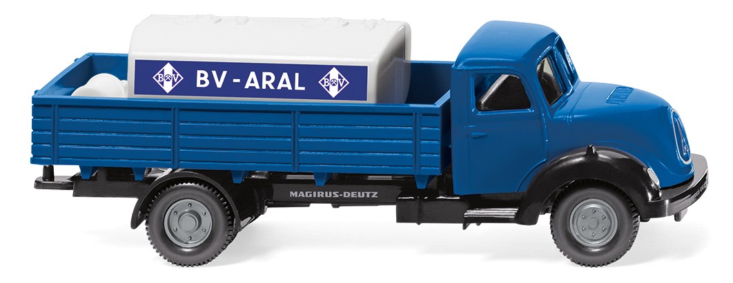Rundhauberfahrerhaus und Pritsche verkehrsblau, Inneneinrichtung schwarz, Pritschenboden staubgrau. Fahrgestell mit Zughaken und Kardanteil schwarz. Felgen silber. Tankober- und ?unterteil sowie Schlauchhaspel und Schlauch weiß. Seitliche Tankbedruckung mit verkehrsblauem Streifen und weißem Schriftzug ?B.V. Aral?. Frontseitiger Kühlergrillrahmen und Magirus-Logo gesilbert. Stoßstange und seitliches Fahrgestell mit silbernem Schriftzug Magirus Deutz. Scheinwerfer frontseitig handbemalt.