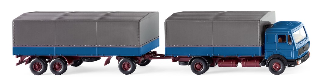 NG-Baureihe hat sich den Youngtimer-Charakter verdient Vor mehr als 40 Jahren eine Errungenschaft der damals aktuellen Mercedes-Benz-Produktion hat sich die Neue Generation, kurz NG-Baureihe, den Youngtimercharakter längst verdient. WIKING würdigte die Nachfolger der kubischen Baureihe von Anfang an mit entsprechenden Typenklassen, darunter auch die Fernverkehrsversion mit langem Fahrerhaus, die die Siebziger- und Achtzigerjahre auf deutschen und europäischen Straßen dominierte. Für den Pritschenhängerzug gibt es jetzt ein Wiedersehen in der Serie, natürlich mit der azurblauen Karosseriefarbe, die damals eine große Verbreitung erfuhr. Fahrerhaus und Pritsche azurblau, Fahrgestell und Felgen oxidrot. Fahrerhausunterteil, Ansaugstutzen und Kotflügel schwarz. Inneneinrichtung olivbraun. Schwarzer Kühlergrill mit silbern aufgedrucktem Mercedes-Benz-Stern. Plane schiefergrau. Scheinwerfer gesilbert, Blinker orange und Rückleuchten rot bedruckt. Anhänger mit Pritsche azurblau, Fahrgestell mit Deichsel und Drehschemel sowie Felgen oxidrot. Plane schiefergrau.