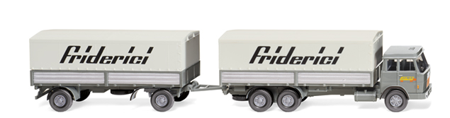 Fahrerhaus staubgrau, Inneneinrichtung zeltgrau. Fahrgestell mit Kardanwelle sowie Doppelkotflügeln und Alupritsche staubgrau. Pritscheneinleger silber. Plane grauweiß, Felgen silber. Frontseitig silberne Typenbedruckung mit Hanomag-Henschel-Schriftzug und Zierstreifen. Fahrerhaustüren mit Friderici-Logo sowie gesilberte Türgriffe. Kotflügelkanten schwarz bedruckt, Blinker gelborange. Rückleuchten karminrot aufgedruckt. Kotflügelkanten schwarz bedruckt, Aluklappen silbern gestaltet. Auf den Planenseiten schwarzer Friderici-Schriftzug. Anhänger mit staubgrauem Fahrgestell, Kotflügeln, Drehschemel und Deichsel sowie Pritsche. Pritscheneinleger silber. Felgen silber gehalten. Verdeck grauweiß. Seitliche Kotflügelkanten schwarz bedruckt, Rücklichter karminrot. Planenseiten mit schwarzem Friderici-Schriftzug.