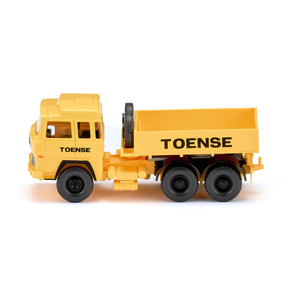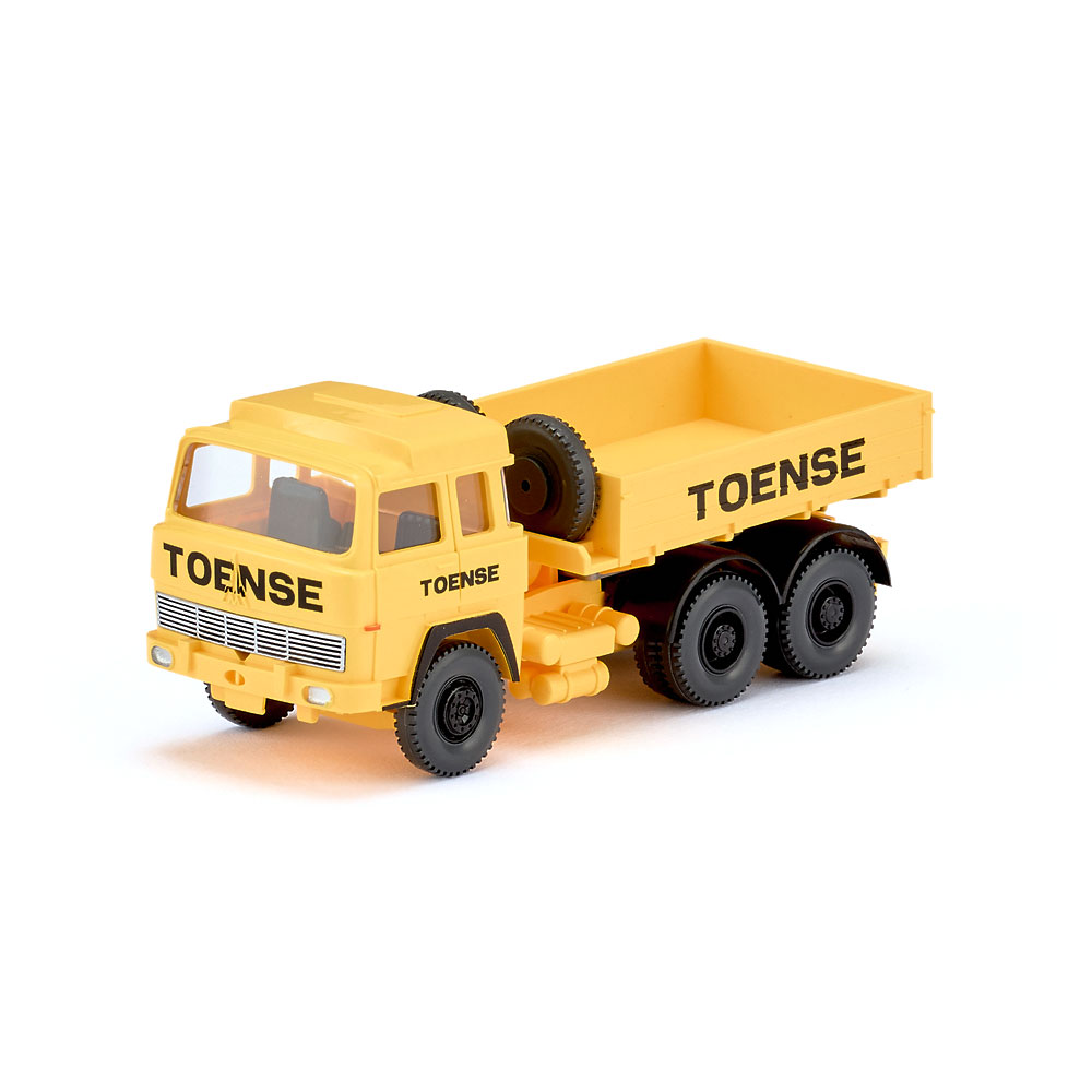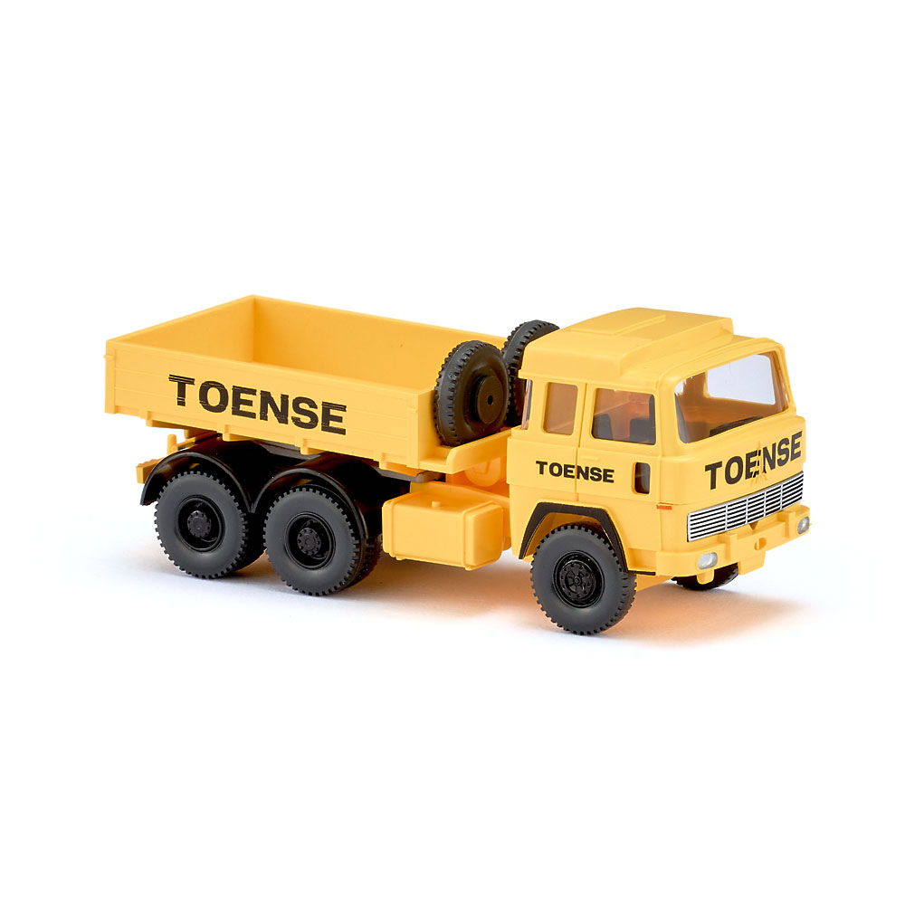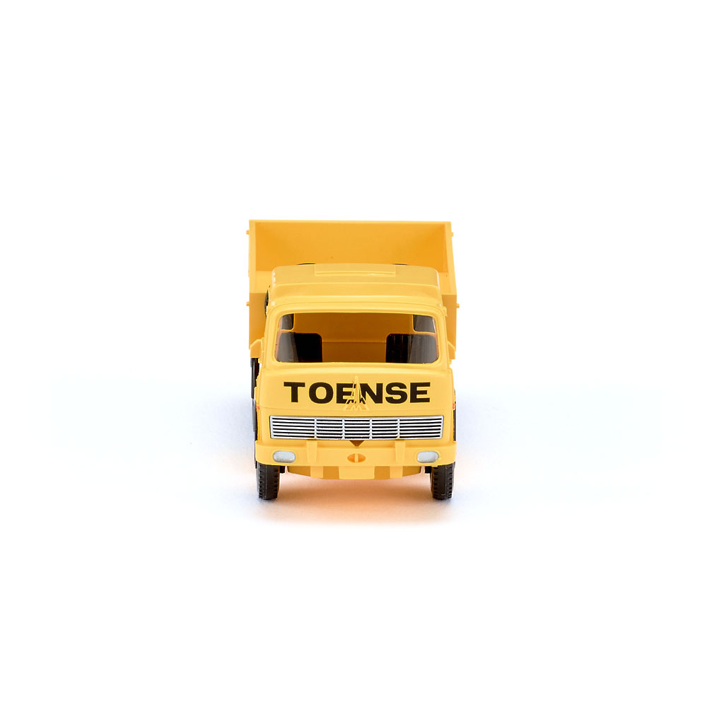 Auf Toense-Magirus war jederzeit Verlass Der luftgekühlte Deutz-Diesel heulte unter der Karosserie des Magirus Transeuropa-Fahrerhauses. Tatsächlich stand die Zugmaschine beim Schwerlastspezialisten Toense jahrelang in Diensten und leistete dankbare Zugarbeit. Besonders auffällig war mit dem Serienstart die stufige Fernfahrerkabine, die dem Fahrer für die Ansprüche der damaligen Zeit deutlich mehr Komfort bot als noch die vorherige Magirus-Generation. WIKING miniaturisiert die damals innovative Fernverkehrsausführung des Magirus 235 D nach historischen Unterlagen von 1963. Die Frontlenker-Generation von Magirus war 1963 auf der IAA vorgestellt worden und fand dank der luftgekühlten, verlässlichen Deutz-Motoren rasch Eingang in zahlreiche Speditionsfuhrparks. Fahrerhaus zinkgelb, Inneneinrichtung schwarz. Fahrgestell mit Anhängerkupplung und Kardanwelle zinkgelb. Felgen und Kotflügeln schwarz. Auf der Front sowie auf den Türen schwarze Toense-Lettern. Kotflügel fahrerhausseitig schwarz bedruckt. Blinker orange, Rückleuchten rot bedruckt. Zinkgelbe Schwerlastpritsche mit schwarzen Toense-Lettern.
