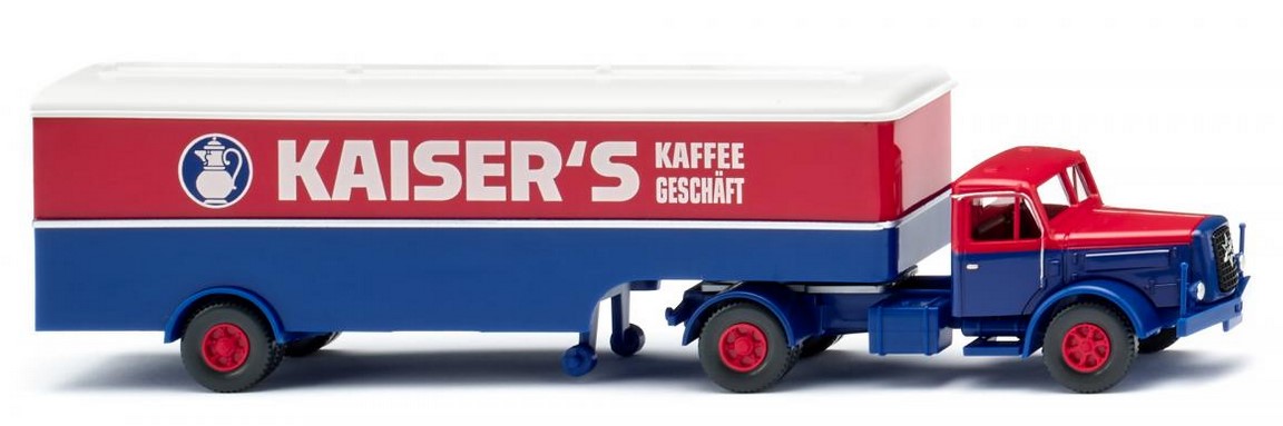 So kam Kaiser's Kaffee pünktlich in die Läden Der Henschel-Hauber HS 140 war ein Zugpferd, auf das Kaiser's Kaffee-Geschäft in der Nachkriegszeit nicht verzichten wollte. Der Ackermann-Kofferauflieger war so etwas wie ein Raumwunder, denn bei der Belieferung des Filialnetzes konnte das mächtige Gespann in seiner markentypisch prägnanten Zweifarblackierung sein Transportvolumen vollends ausspielen. Zu tun gab es für das Sattelzug-Vorbild genug, denn schon 1952 wurde in Duisburg das erste Selbstbedienungsgeschäft eröffnet. 1969 betrieb die Kaiser's Kaffee-Geschäft AG 565 Filialen. 1971 wurde die Kaiser's Kaffee Geschäft AG von der Unternehmensgruppe Tengelmann übernommen. Bis zum Ende von Kaiser's Tengelmann 2016 erfreuten sich die Filialen einer hohen Wertschätzung. Zugmaschine mit karminrotem Fahrerhaus und schokobrauner Inneneinrichtung. Vordere und hintere Kotflügel, aber auch Scheinwerferleiste, Fahrgestell und Kardanteil ultramarinblau. Trilex-Felgen karminrot. Umlaufend ultramarinblaue Bedruckung an den unteren Flanken. Auflieger mit Ackermann-Kofferunterteil ultramarinblau, Kofferoberteil karminrot. Kofferdach weiß gehalten. Seitliche Flankengestaltung mit "Kaiser's Kaffee".