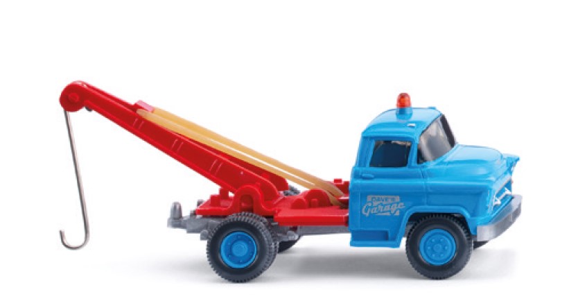 Der US-Chevrolet mit den spitzen Kotflügeln Diese modellbauerische Würdigung hat sich der Chevrolet der Baujahre 1955/56 verdient und so schickt WIKING den Formenklassiker als Abschleppwagen von Daves Garage in Sammlerhand. Der Chevrolet-Lkw in 1:87 fand bei seiner WIKING-Premiere vor fast 50 Jahren seltener den deutschen Modellkäufergeschmack, sondern sollte vielmehr die Internationalität in der WIKING-Typenpalette erweitern. So erfreut sich dieses Modell heute der Wertschätzung als US-Meilenstein, auch weil er für das Amerika-Gefühl damaliger Jahrzehnte steht. Die US-Lastwagen aus dem Hause Chevrolet waren mit ihren spitzen Kotflügeln in den Nachkriegsjahrzehnten ganz und gar andersartig als die Formensprache der Lkw aus deutscher Produktion. Fahrerhaus blau, Verglasung topas. Blauer Sockel mit orangetransparent eingesetztem Warnlicht. Silbernes Fahrgestell mit Kardanwelle, Felgen blau. Karminroter Kranaufbau mit gleichfarbigem Kranarm. Frontseitig gesilberte Scheinwerfer und Grillgestaltung. Blinker verkehrsorange bedruckt. Seitlich silberne Türbedruckung mit Schriftzug "Dave`s Garage".