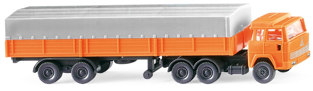 Transeuropa-Sattelzug in 160-facher Miniaturisierung Das stufige Transeuropa-Fahrerhaus war 1963 das optische Signal für die neue Frontlenker-Generation von Magirus-Deutz. Nach der IAA kündete der Ulmer Fernverkehrs-Lkw damals vom Aufbruch von Magirus in eine neue Zeit. Der Pritschensattelzug in 160-facher Miniaturisierung steht damit für die damalige Logistikinitiative leistungsfähiger Lkw-Gespanne. Fahrerhaus orange, Fahrgestell schwarzgrau. Fahrerhausfront mit silbernem Magirus-Logo und Kühlergrillstegen. Frontscheinwerfer per Hand gesilbert. Aufliegerfahrgestell, Kotflügel mit Achsen und Rädern schwarzgrau. Pritsche orange, Plane silbergrau.