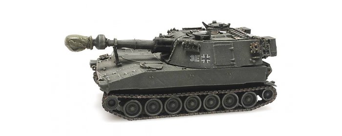 Fertigmodell. Panzerhaubitze M109G der Bundeswehr für den Eisenbahntransport.