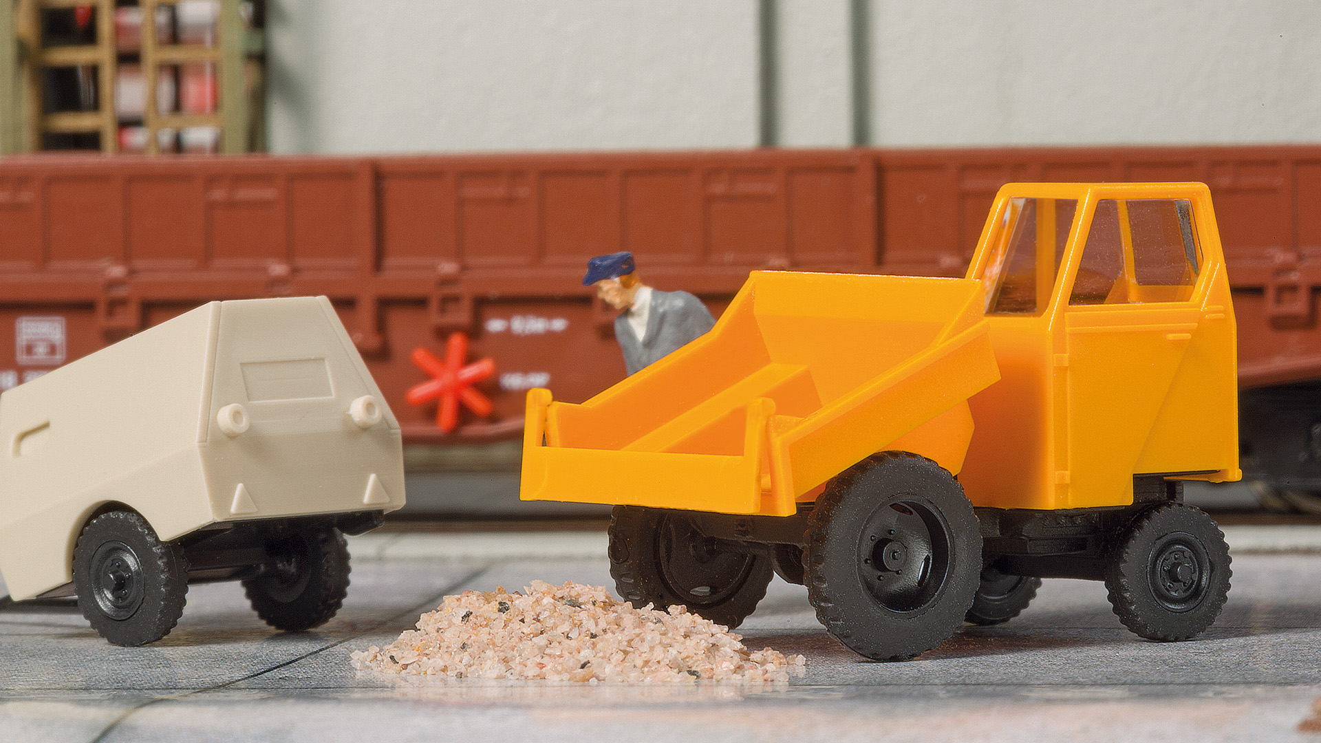 Bausatz. Der Waran 1500 ist ein Vorderkipper mit Nachbildung der Schwerkraft-Kippmulde und vorbildgerechter Bereifung. Fahrzeuge dieser Art kommen vor allem im Baugewerbe zum Einsatz.Der Kompressoranhänger liefert die auf vielen Baustellen nötige Druckluft.Waran 22 × 15 × 17 mmKompressoranhänger 22 × 11 × 12 mm