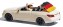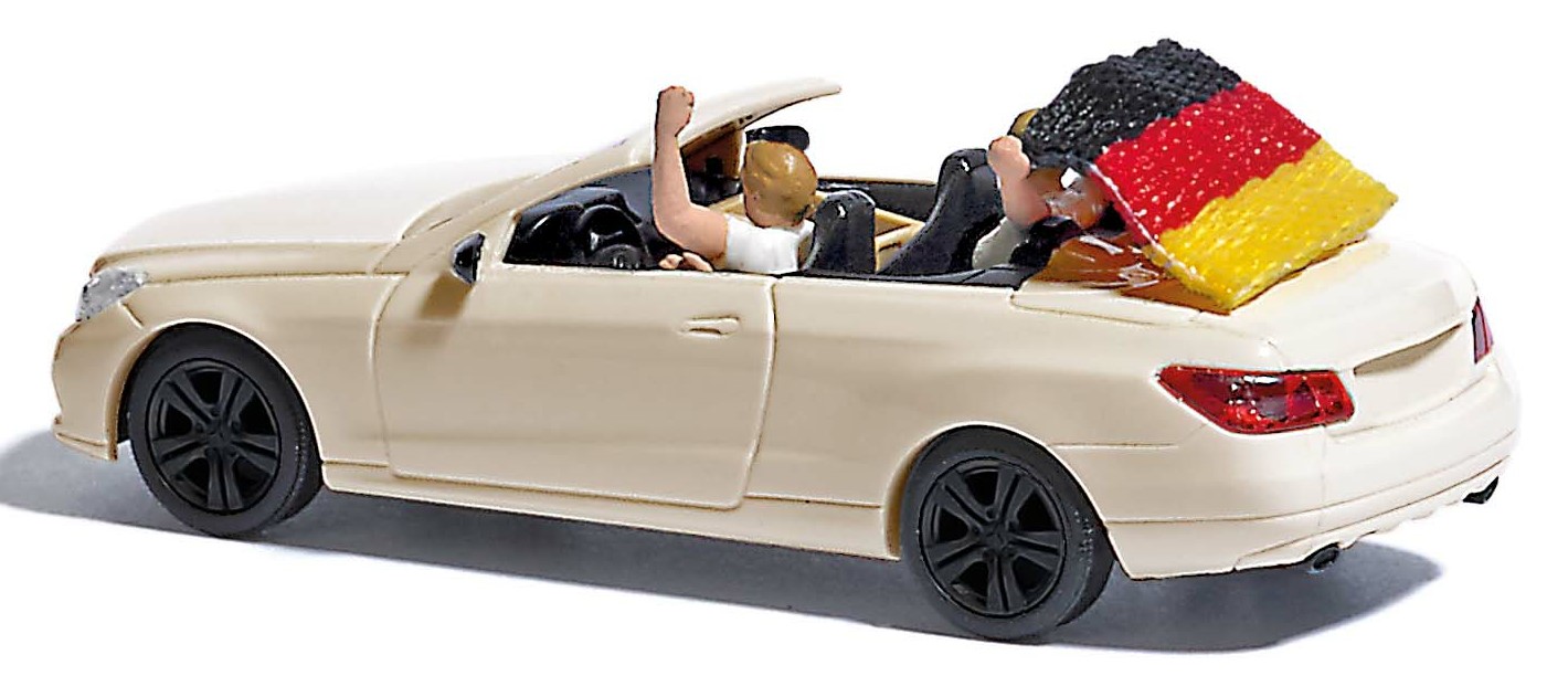Mercedes-Benz E-Klasse Cabriolet mit Fahrer, Fahnenträgerin und einem Kasten Bier auf dem Beifahrersitz.