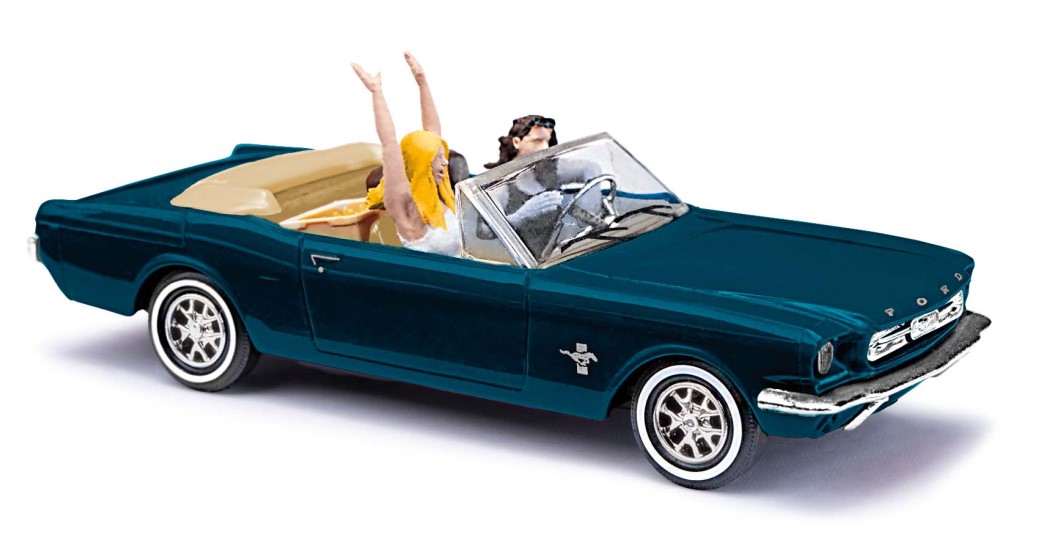 Mädels on Tour! Linda und Susi sind kräftig am Feiern ? hat eine neue Boutique aufgemacht Susi ist jedenfalls außer sich vor Freude und wirft die Hände hoch in die Luft. Das Wasser im Kasten auf dem Rücksitz ist mit Sicherheit nicht der Grund oder ist das etwa »Feuerwasser«??? Am 13. April 1964 wurde dieser markante Sportwagen auf der Weltausstellung in New York der Öffentlichkeit präsentiert. Seiner Premiere ging ein beispielloser Reklamefeldzug in New York voraus. Angepriesen als »Thunderbird des kleinen Mannes« wurde der Mustang gezielt als Sportwagen der unteren Mittelklasse konzipiert. Schon am ersten Verkaufstag hatten alle Fahrzeuge einen Käufer gefunden und mehr als 20.000 Vorbestellungen füllten die Auftragsbücher. Mit einer Gesamt-Verkaufszahl von 680.000 Fahrzeugen im ersten Modelljahr bricht der Mustang alle Rekorde und hält ihn in den USA noch heute. Auch in Deutschland erfreut sich der wunderschöne Sportwagen großer Beliebtheit. Da jedoch der Name »Mustang« markenrechtlich durch die Unternehmen Krupp und Kreidler geschützt war, wurde der 106 PS starke Sportwagen unter der Bezeichnung »T5« vertrieben. Selbst nach so langer Zeit sind die legendäre Form und das sportliche Aussehen noch immer gefragt, was die Retro-Version von 2006, der Mustang GT Premium mit dem Sonderpaket »California Special«, beweist. Das Modell des 1964er Vorbildes ist ebenso beeindruckend wie das Original. Die markante Form wurde präzise wiedergegeben und zeigt sich in einer klaren Linienführung mit haarscharfen Konturen. Viele weitere Details, wie edle Weißwandreifen, verchromte Felgen, eingesetzte Lampen und Blinker, verchromtes Lenkrad sowie feinste Drucke runden das perfekte Erscheinungsbild ab. Mit diesem sportlichen Cabrio auf den Straßen zu fahren ist Genuss pur, die beiden Fahrerinnen sind sichtlich vergnügt und erfreuen sich an den neidischen Blicken der vielen Personen, deren Wege sie kreuzen?