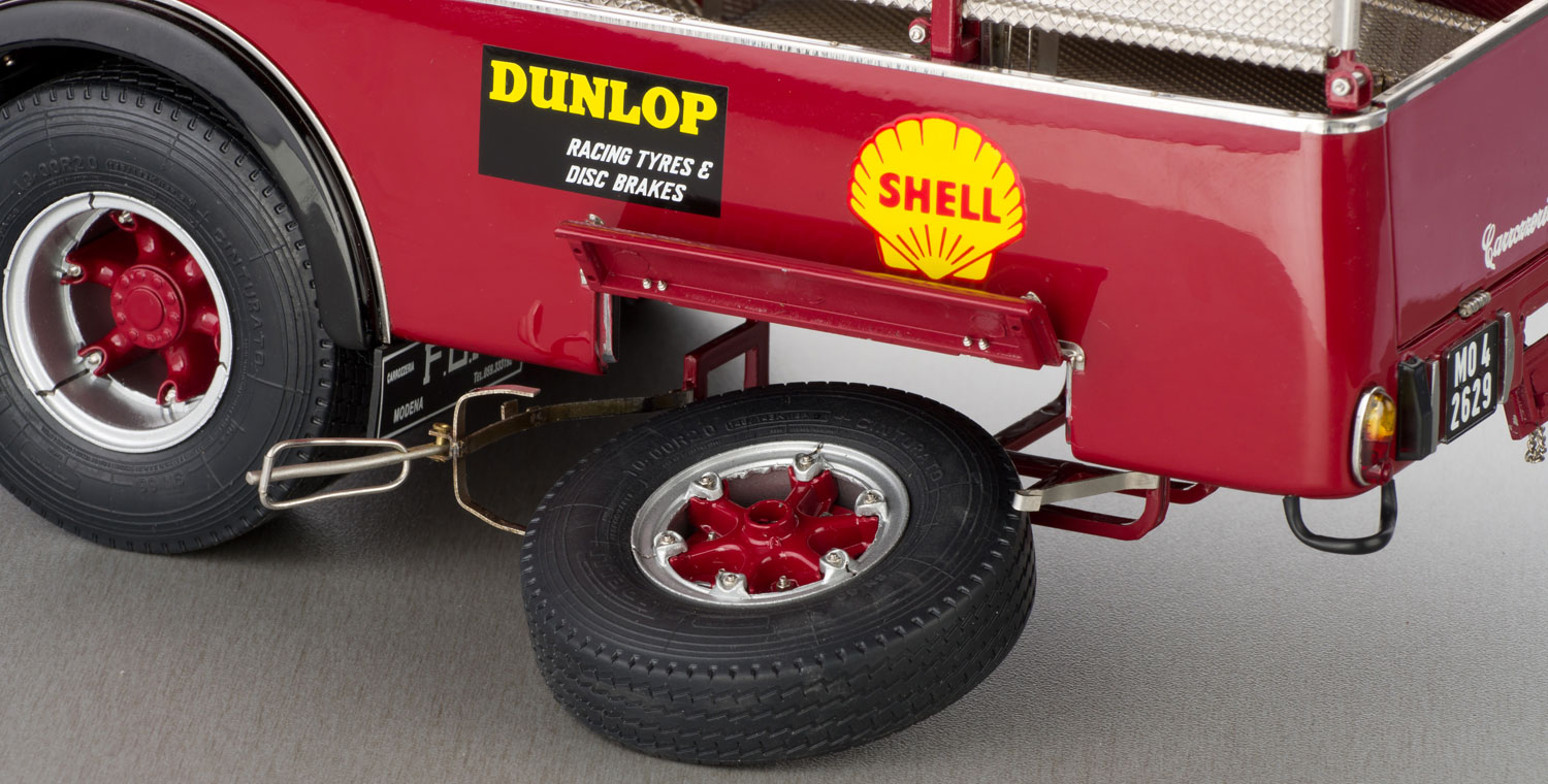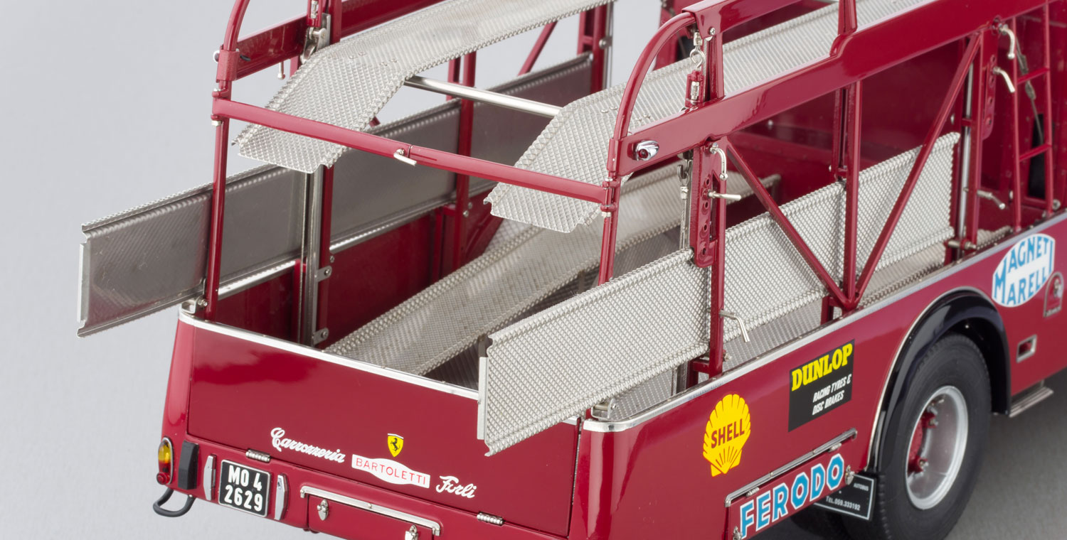 In den 1950er- und 1960er-Jahren waren sie fester Teil des Rennsport-Zirkus: die Renntransporter, mit denen die Formel-1-Teams innerhalb Europas ihre Fahrzeuge zu den Strcken brachten und nach Hause holten. Die weitgehend baugleichen Fahrzeuge der Scuderia Ferrari und der Scuderia Maserati gehören heute zu den wohl bekanntesten und waren damals die technisch ausgereiftesten Vetreter dieses Typs. CMC hat den Ferrari-Renntransporter als Modell der Superlative bis ins kleinste Detail nachgezeichnet.