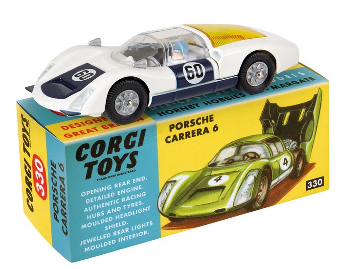 Dieser detaillierte Porsche Carrera 6 war ursprünglich nur zwei Jahre lang erhältlich - von 1967 bis 1969 - und ist typisch für die hochwertigen Modelle, die Corgi während seiner ?goldenen Ära? produzierte. Während er nur in Weiß erhältlich war, gab es zwei Versionen, entweder mit roter oder blauer Motorhaube und Türen - letztere sind viel seltener. Das getönte, durchsichtige Plastik im hinteren Teil, das sich nach oben klappen lässt, um einen detaillierten, verchromten und schwarzen Motor zu enthüllen, basierte auf einem ähnlichen Merkmal des echten Autos. Bei der Version mit roter Motorhaube wurde ein tiefblauer Kunststoff verwendet, beim Modell mit blauer Motorhaube war er entweder gelb oder hellblau.