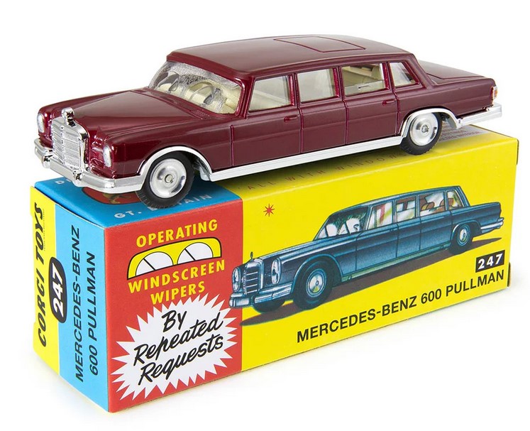 This 1964-issued Corgi was given a unique and exciting feature ? windscreen wipers that appeared to sweep from side to side thanks to an ingenious mechanism connected to the model?s rear axle. A switch on the base turned the wipers on and off. Rather curiously, the Pullman was produced in two similar colours ? a dark cerise and a burgundy. Both versions had the same detailed cream interior with rear passenger windows that could be lowered. The bumpers, grille and side strips were in plated chrome, the front headlights picked out in silver and the rear lights in orange. In line with other Corgi Toys of this era, Corgi 247 was given Glidamatic suspension. It was deleted from the Corgi range in 1969 after sales of around 977,000. Size: Length: 117mm Width: 36mm Height: 27mm