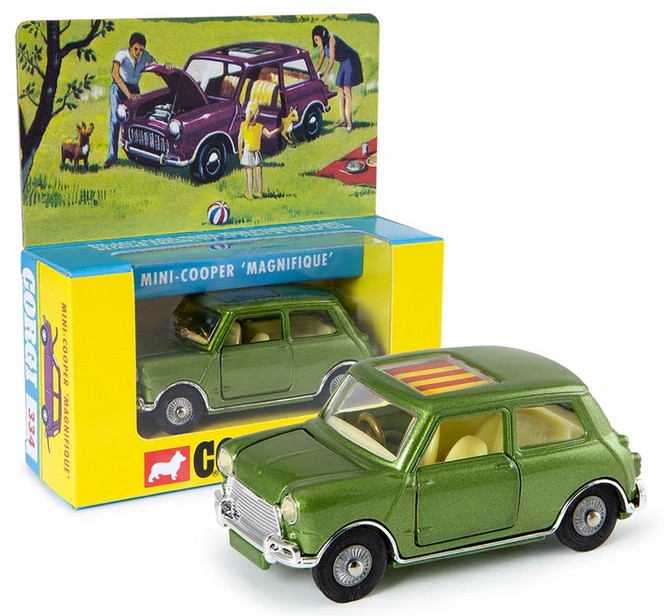 However, what most remember about this detailed Corgi is its colourful striped sliding sun roof! Available in two metallic colours blue or green Corgi 334 was in the range for just two years, disappointingly low sales making it one of the scarcer Corgi Minis today.The casting was later revived as a Whizzwheels BMC Mini Cooper (Corgi 282) which was available between 1971 and 1974