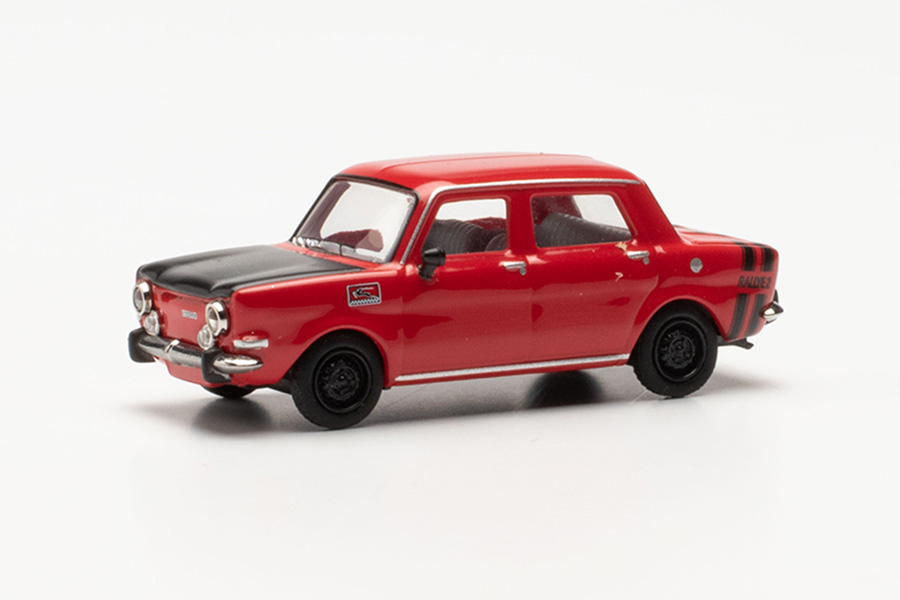 Ein Klassiker von damals ist der Simca Rallye II mit 82 PS mit den typischen Querstreifen am Heck sowie der mattschwarze Motorhaube. Das Modell realisiert Herpa als Miniatur in ginstergelb. Das Vorbild, der Simca 1000 wurde 1961 vorgestellt. Der Simca 1000 Rallye II mit 1294 cm³ (82 PS) Motor folgte im September 1972.. Artikel in verschiedenen Farben produziert. Gelieferte Farbe kann vom Bild abweichen.