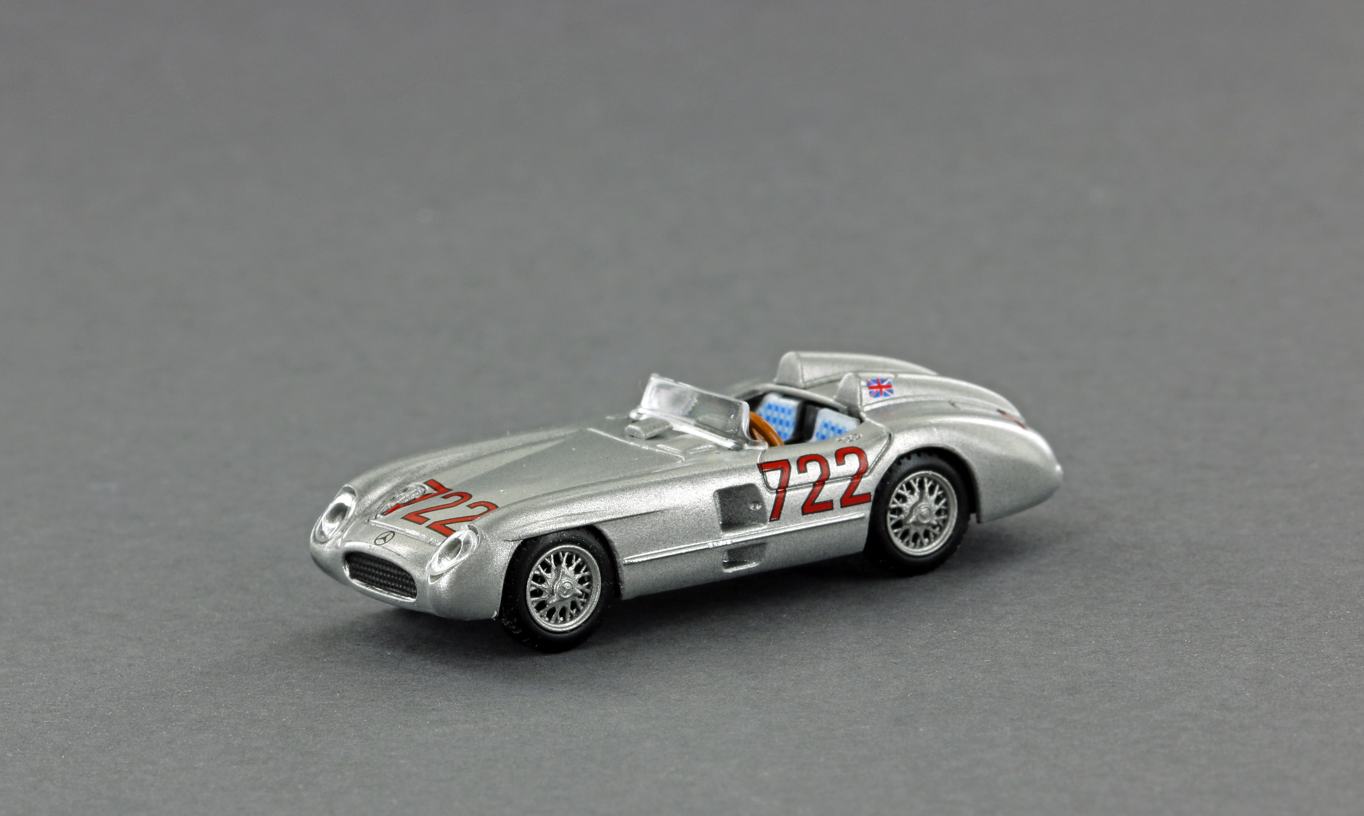 Die alljährliche Großveranstaltung der Mille Miglia hatte im Jahre 1955 ein besonders attraktives Teilnehmerfeld. Mercedes-Benz hatte Großes vor und entsandte eine Armada von vier Rennsportfahrzeugen des Typs 300 SLR, die erstmals zum Einsatz kamen. Bekannte Spitzenfahrer sollten den schärfsten Konkurrenten wie Ferrari, Maserati und Aston Martin den Sieg streitig machen. Halb Italien war auf den Beinen und fieberte dem nationalen Rennsportereignis entgegen. Die Wagen starteten von der berühmten Startrampe in Brescia im Minutenabstand. Als erster des Mercedes-Teams verließ um 6:58 Uhr mit der ausgelosten Start-Nr. 658 (Startnummer= Startzeit) J.M. Fangio als Alleinfahrer den Start- und Zielort Brescia. Als nächster SLR-Fahrer nahm um 7:01 Uhr Karl Kling mit der Start-Nr. 701 die 1600 km lange Strecke unter die Räder. Danach verabschiedete sich um 7:04 Uhr das Fahrerteam um Hans Herrmann mit Beifahrer Hermann Eger mit der Start-Nr. 704 von Brescia und gab dem SLR die Sporen. Zu guter Letzt katapulitierte sich der junge Draufgänger Stirling Moss mit seinem Beifahrer Denis Jenkinson um 7:22 Uhr mit der Startnummer 722 in die Rennschlacht. Aufgrund seiner besonnenen Fahrweise und seinem überragenden Können hinter dem Lenkrad erreicht J.M. Fangio hinter dem Sieger Stirling Moss (ebenfalls auf einem SLR) als zweiter Sieger das Ziel in Brescia.